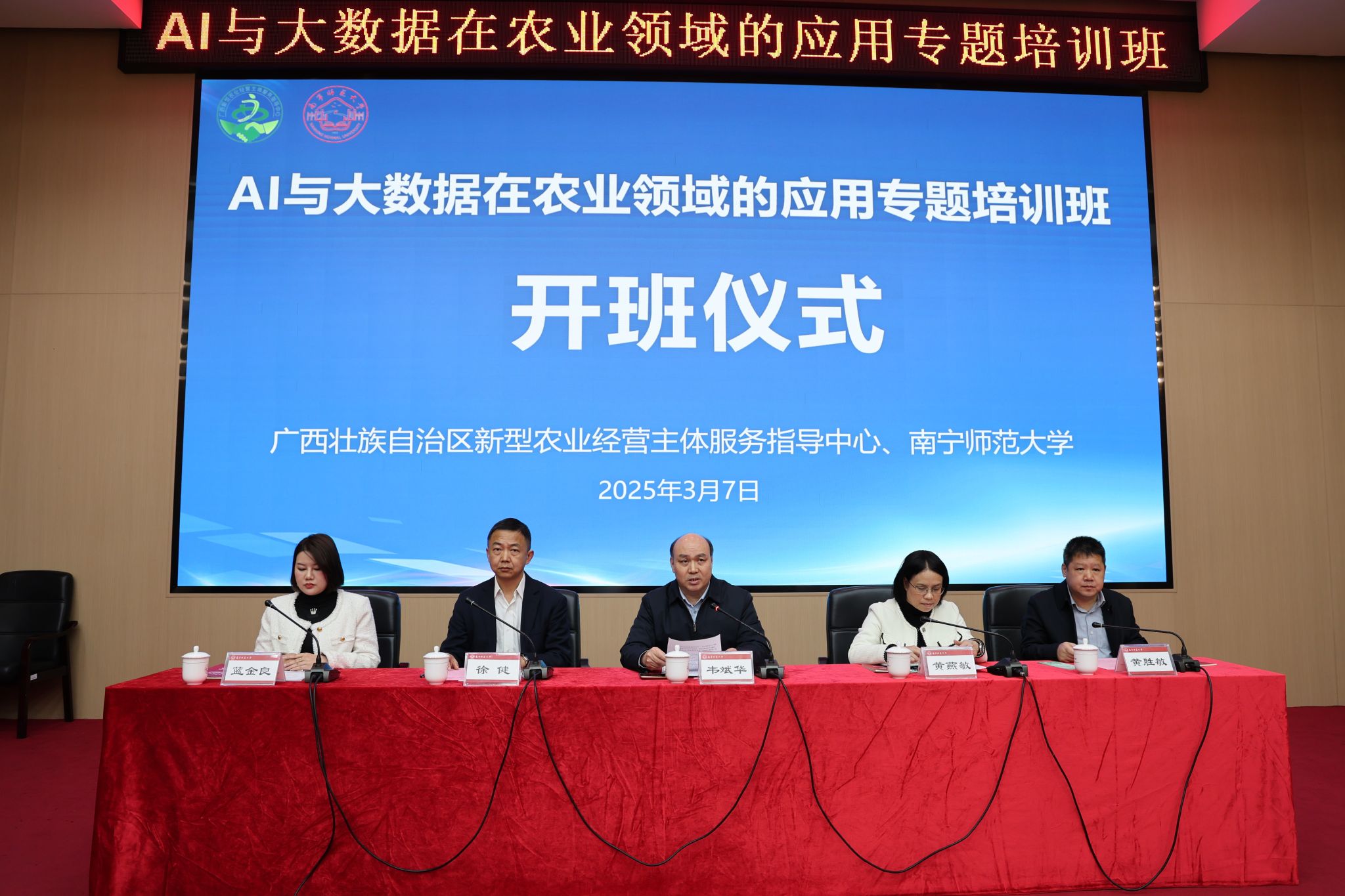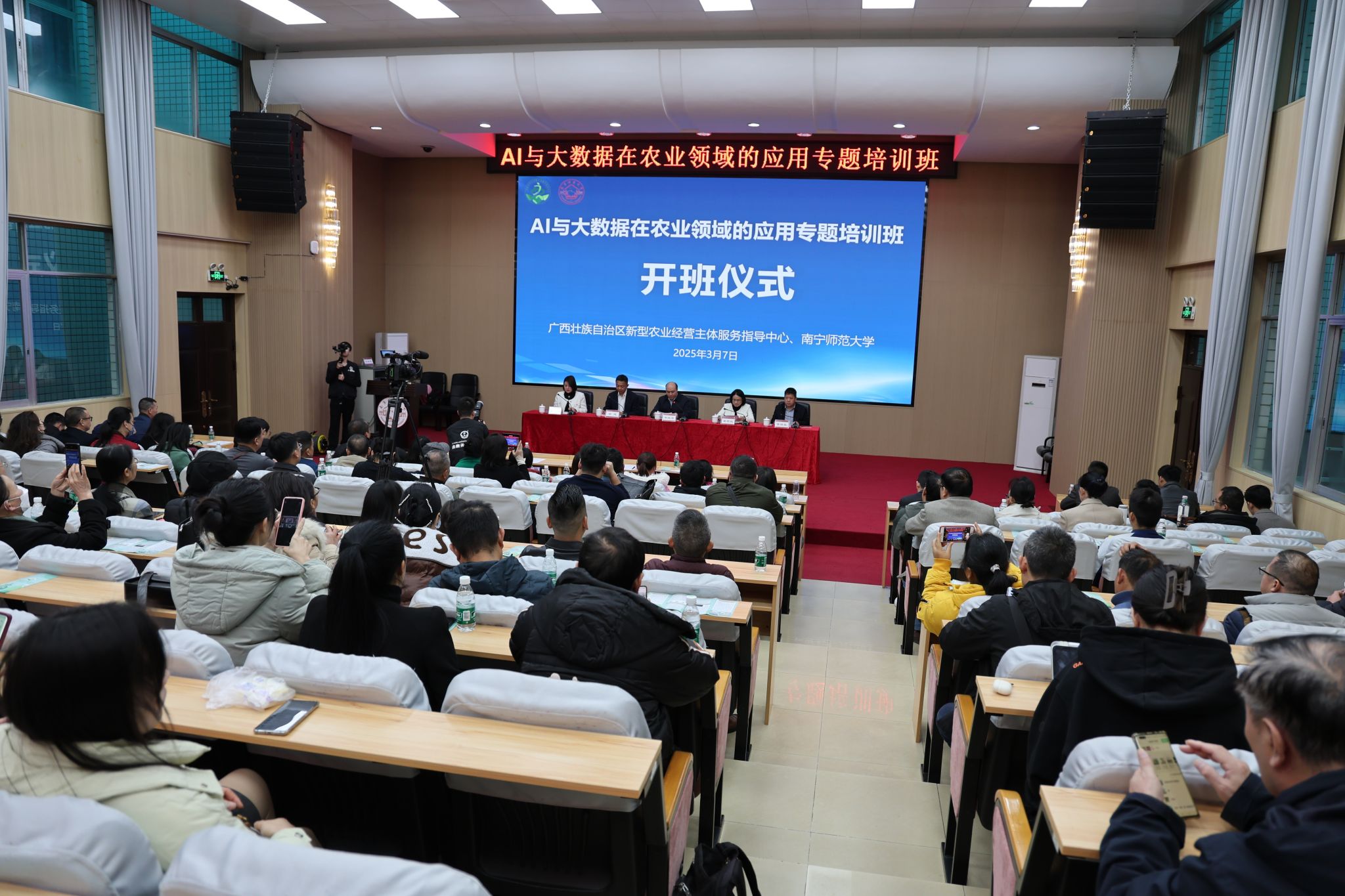 3月7日,我校与广西壮族自治区新型农业经营主体服务指导中心携手,在我校明秀校区举办了“AI与大数据在农业领域的应用”专题培训班。此次培训班吸引了180名来自全区各地市的涉农企业、农民专业合作社、家庭农场等代表踊跃参加。自治区农业农村厅农村合作经济指导处处长韦斌华、自治区新型农业经营主体服务指导中心主任蓝金良以及我校科研管理处处长黄燕敏、继续教育学院院长徐健、地理与海洋研究院党委书记黄胜敏出席了开班仪式。