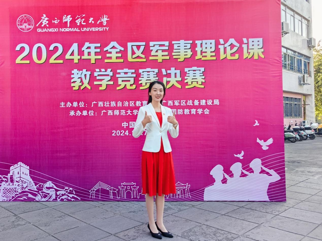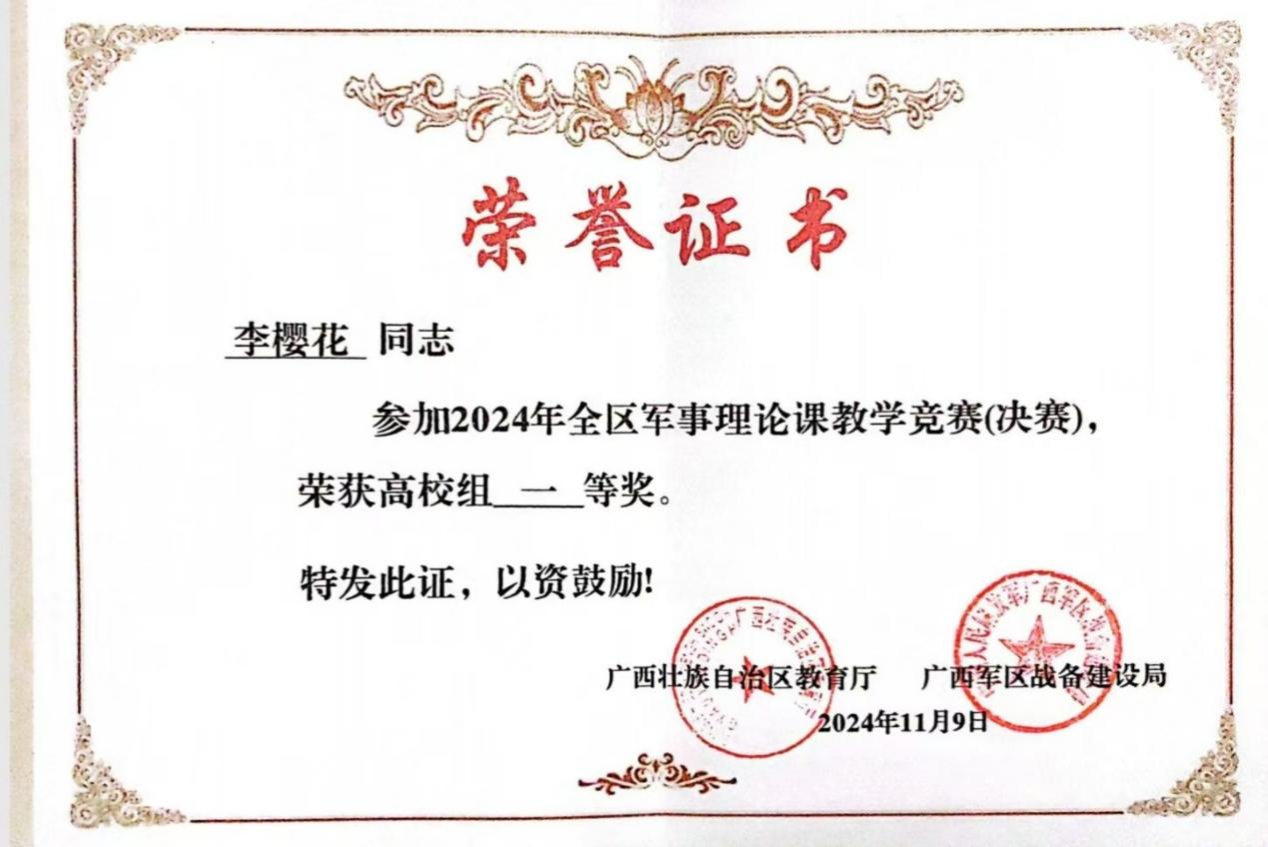 2024年全区高校军事理论课教学竞赛(决赛)由广西壮族自治区教育厅、广西军区战备建设局主办,广西师范大学、广西高校国防教育学会共同承办。大赛分为初赛和决赛两个阶段,共有211名军事理论课教师参加初赛,仅有20名教师进入高校组决赛。决赛评委从教学设计、教学内容、教学方法、教学素养等四个方面共13项内容进行综合测评。我校李樱花老师凭借扎实的理论基础、精湛的案例演示、严谨细致的教学风格,经过激烈角逐,最终荣获一等奖。