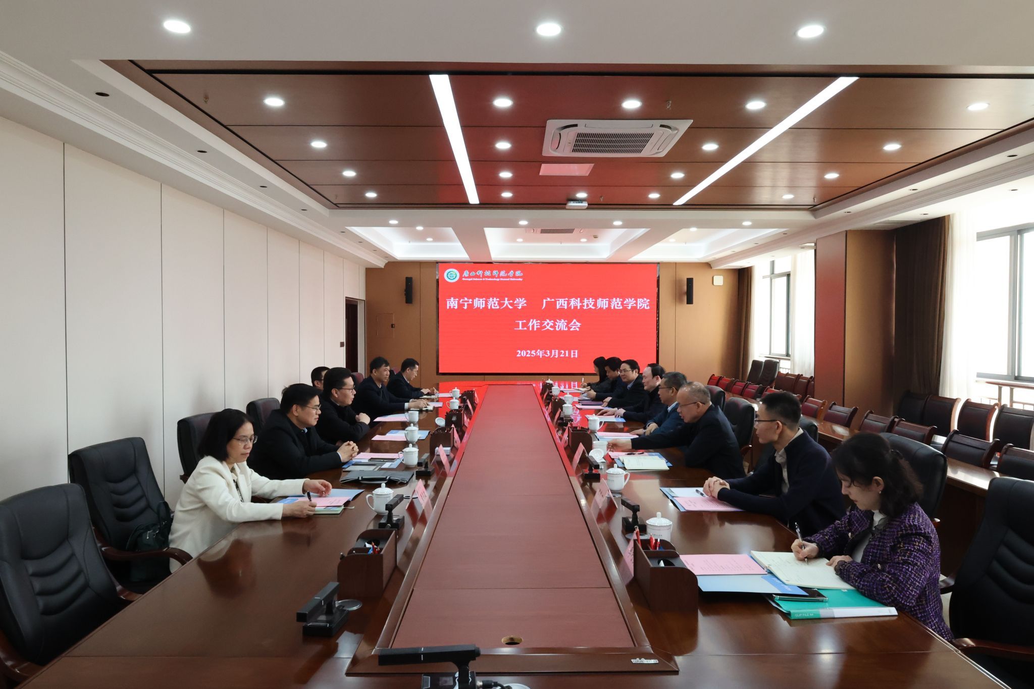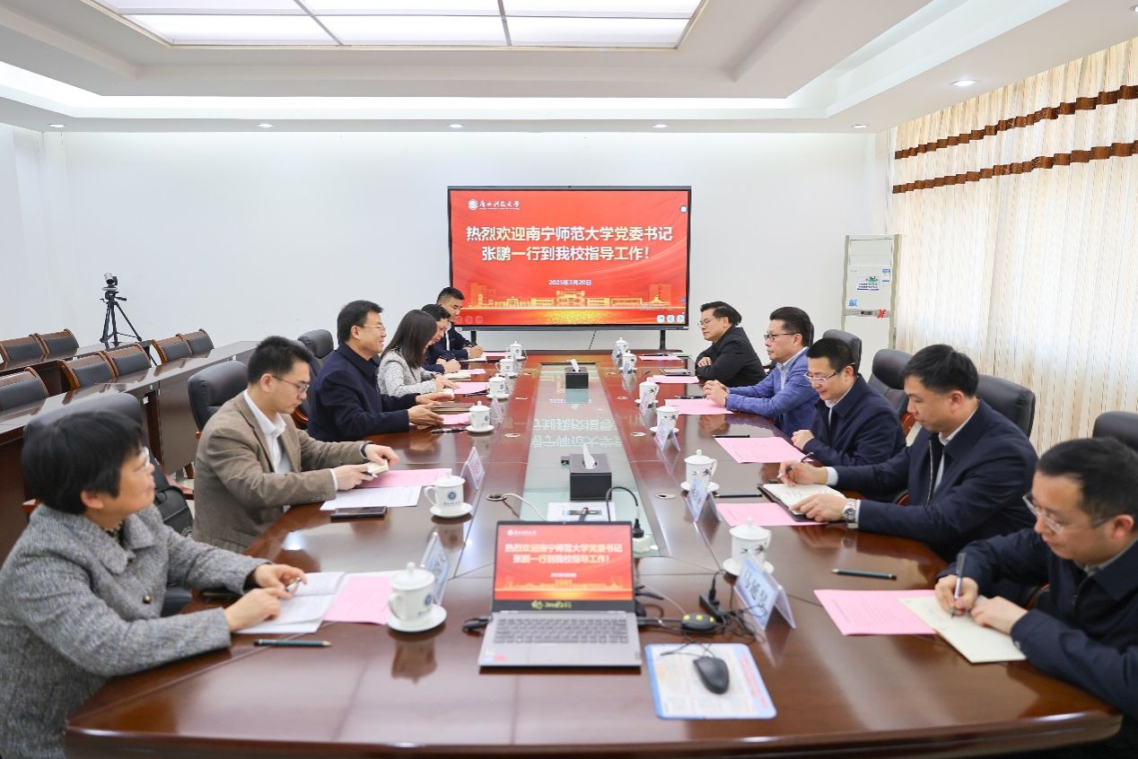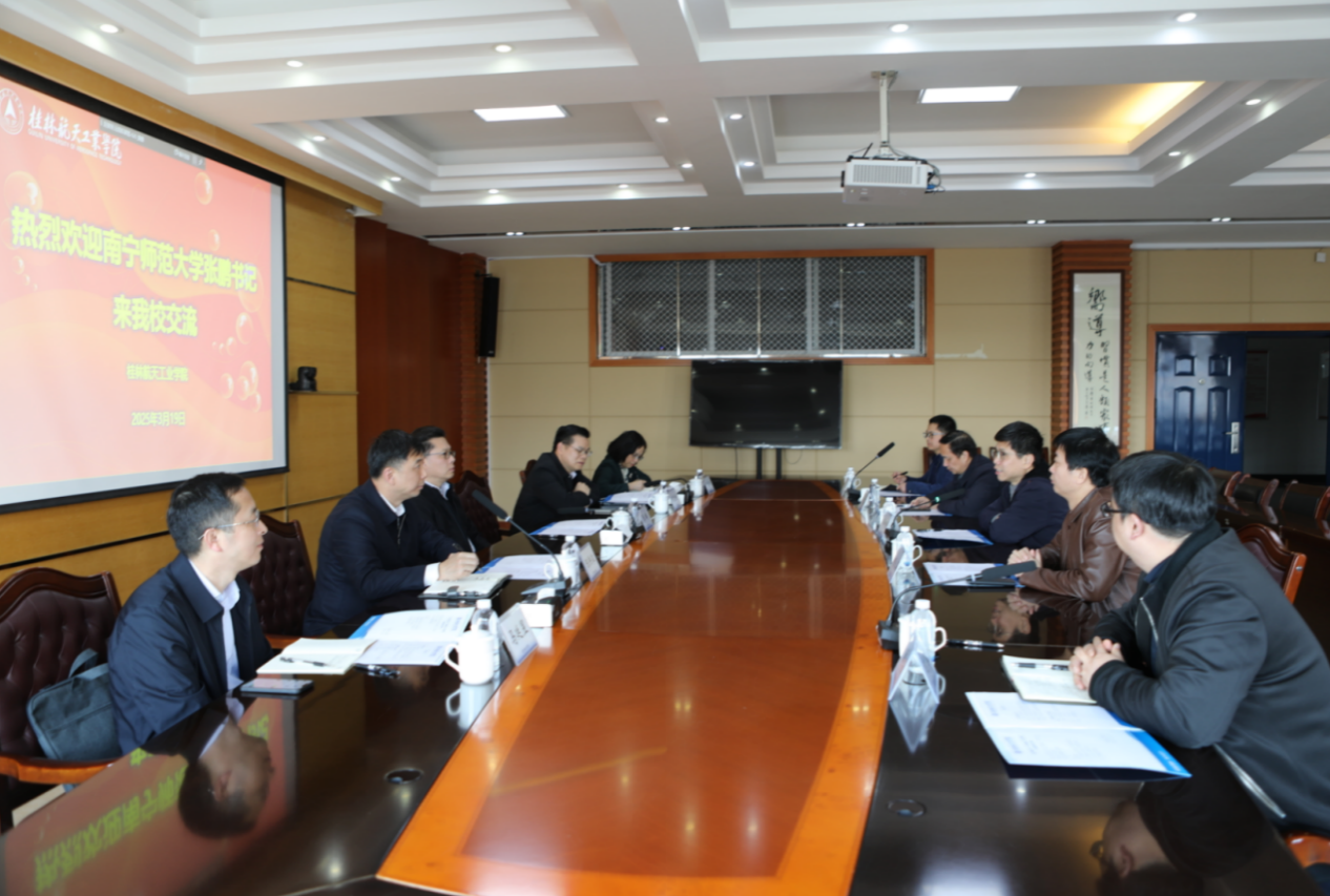 3月20日,广西科技大学党委书记赵君、副校长邓朗妮热情接待了张鹏一行。双方在文昌校区办公楼5—1会议室座谈交流。该校有关部门负责人分别围绕人才强校、科研工作、实验室实训基地建设等作了专题汇报。我校有关部门负责人就校地企合作、机构改革、人事管理、实验室管理等方面工作向对方请教。会前,张鹏一行实地参观学校规划馆、文昌校区和柳东校区相关实验室。