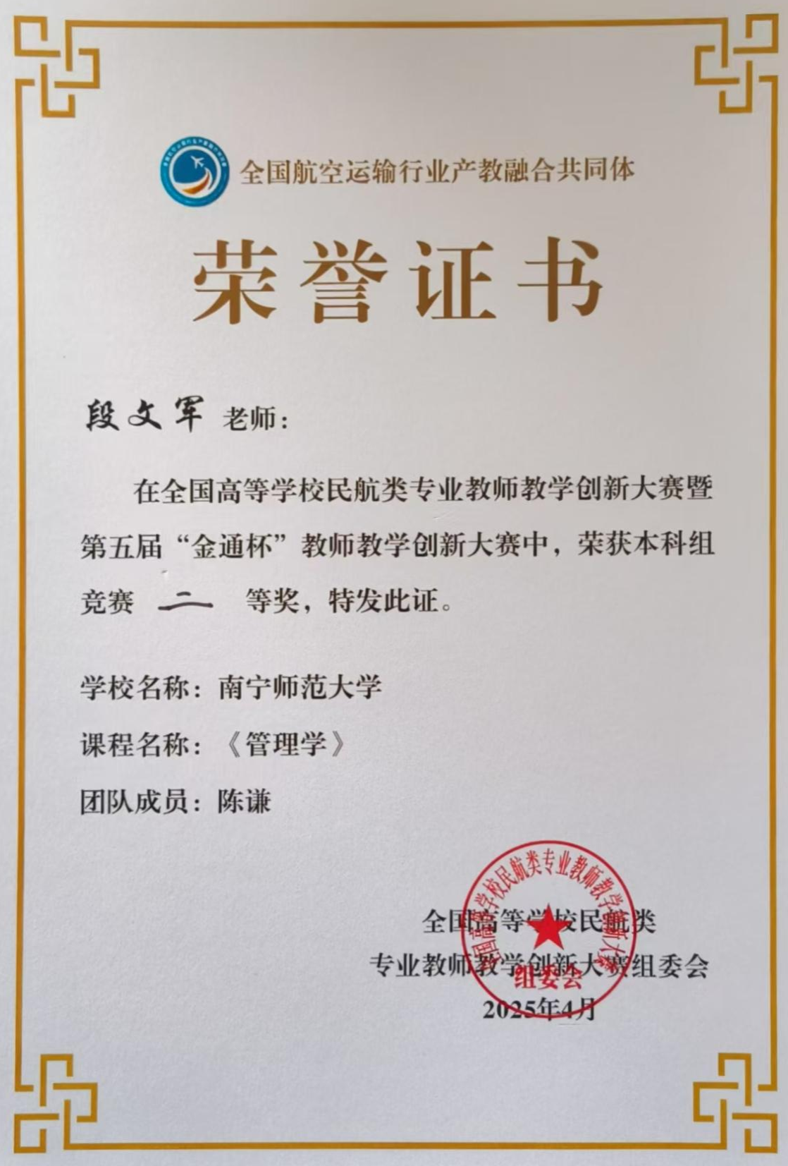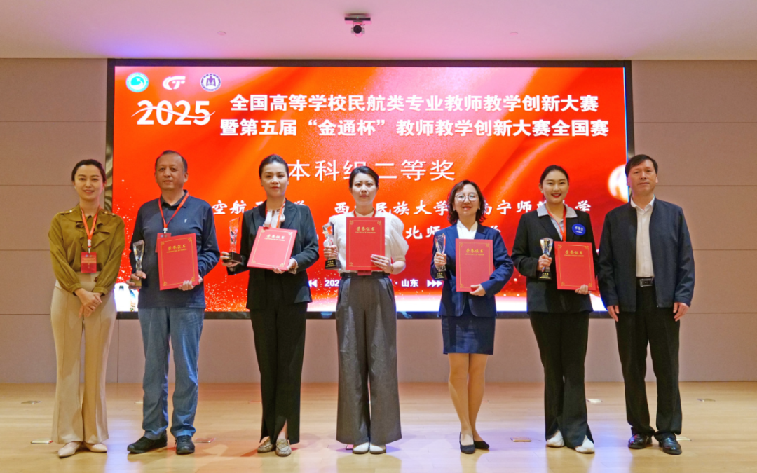 4月23日-25日,由中国交通教育研究会职业教育分会、全国航空运输行业产教融合共同体、北京广慧金通教育集团主办的全国高等学校民航类专业教师教学创新大赛暨第五届“金通杯”教师教学创新大赛决赛在山东曲阜举办。本次大赛包括本科、高职两条赛道,经过网络评审,层层选拔,全国共有31支优秀教师团队入围总决赛。在现场总决赛中,我校派出的旅游与文化学院段文军、陈谦老师团队荣获本科组二等奖。