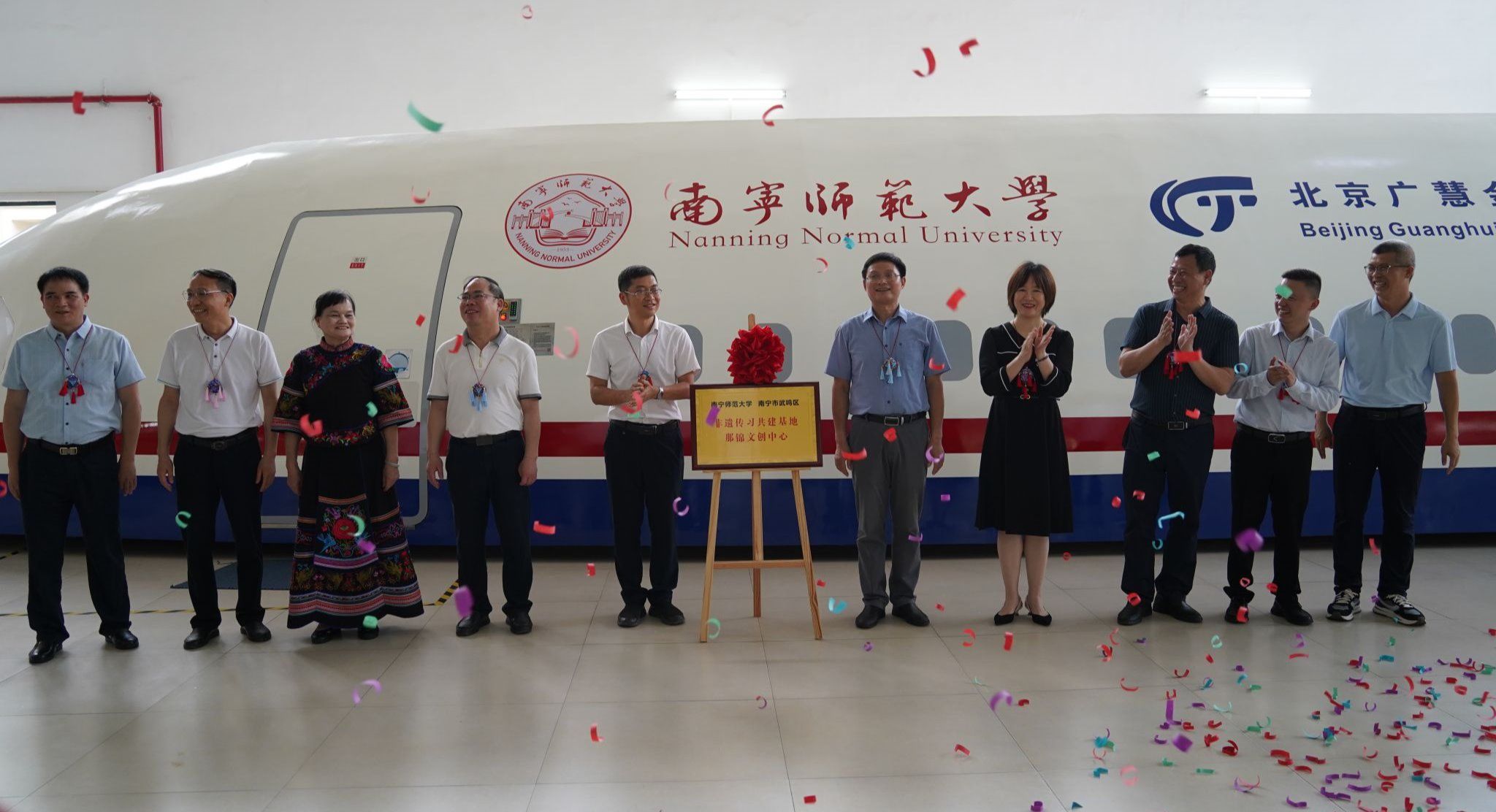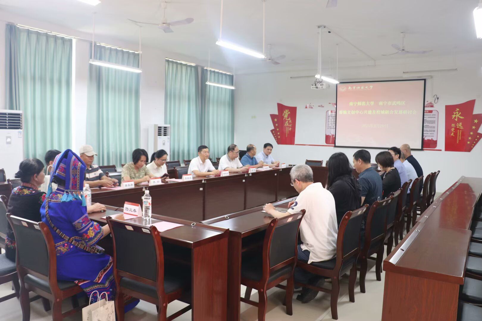 那锦文创中心是南宁师范大学和武鸣区共同创办,将依托高校学术资源和城区丰富的非遗资源,开展手工刺绣、民族服饰设计、文创产品开发等教学实践活动,打造非遗进校园标杆及校城融合示范工程,辐射带动南宁教育园区高校和武鸣区多领域融合发展。揭牌后,校地双方围绕中心建设与校城融合召开了专题研讨会,就人才培养、项目落地、产业发展等议题深入交流。