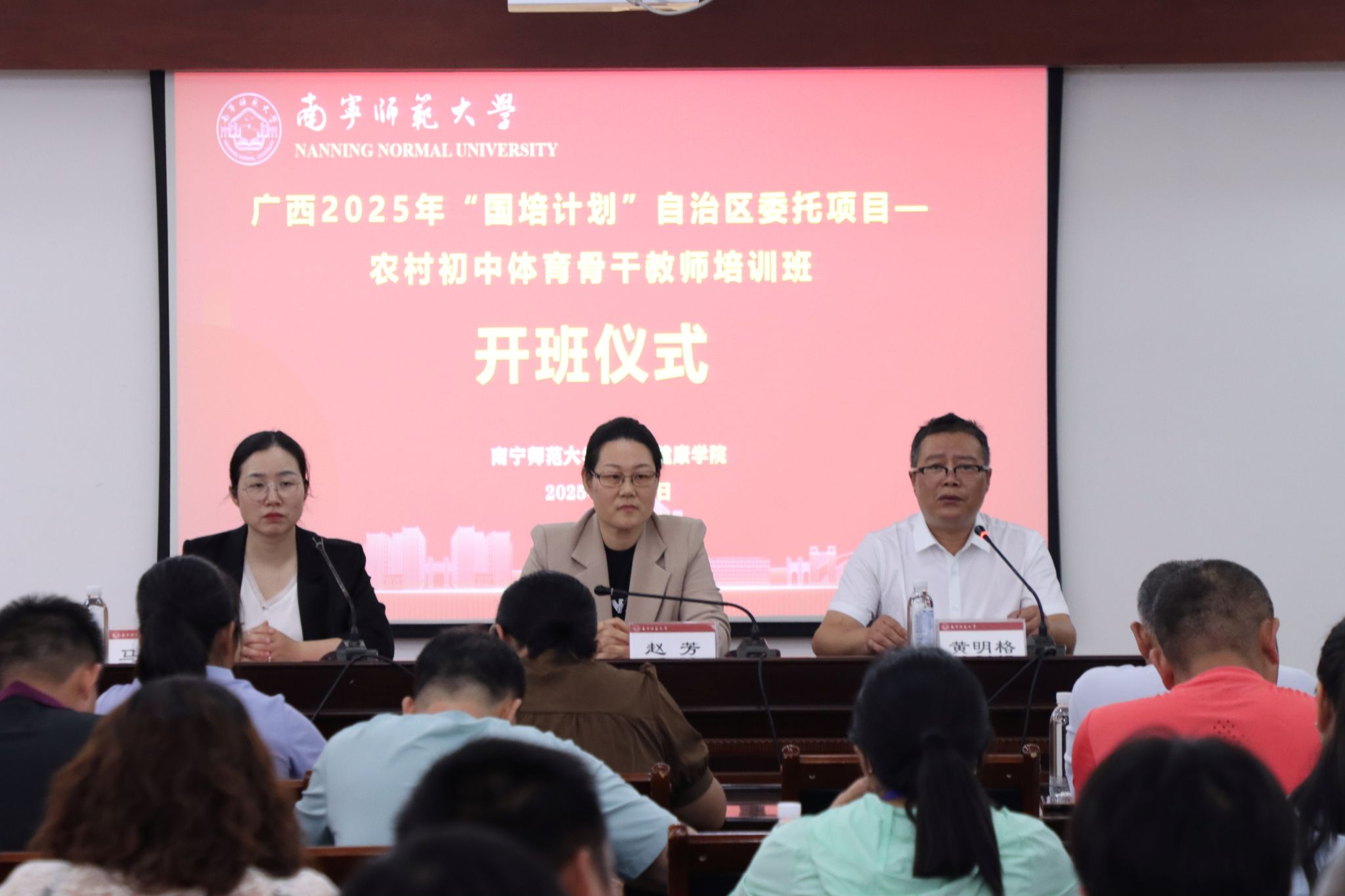为贯彻落实党和国家的教育方针,提高广西农村初中体育教师的专业素养,5月10日,广西2025年“国培计划”自治区委托项目——广西农村初中体育骨干教师培训班在南宁师范大学明秀校区鸿远楼409室顺利开班。我校教育学院副院长黄明格,体育与健康学院院长赵芳,院长助理,培训班班主任以及来自全区的100名农村初中体育骨干教师参加。