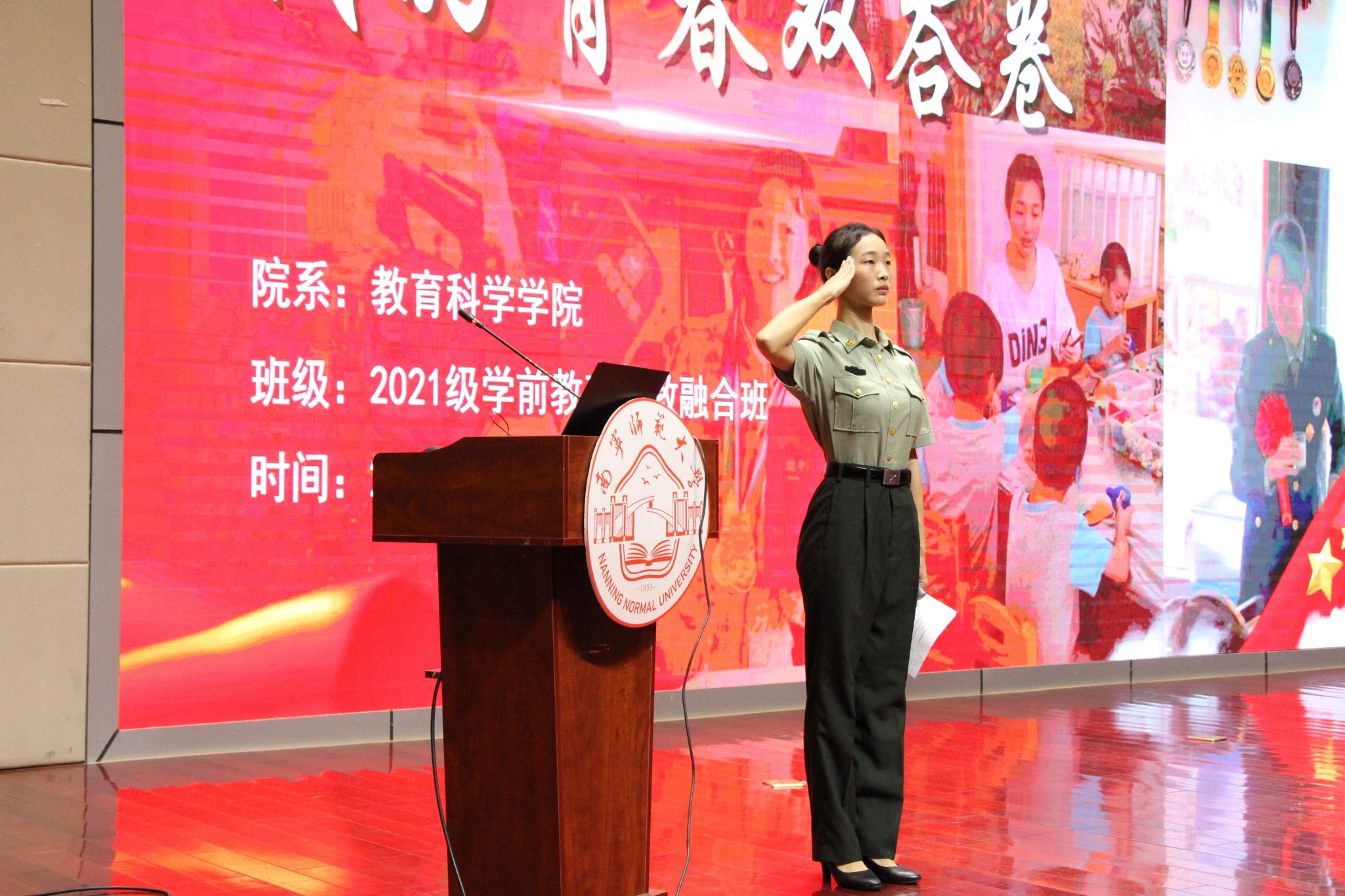 来自教育科学学院的李凌红和大家分享她的两份“青春答卷”:一份是“幼师成长录”,一份是“军营奋斗史”。她鼓励同学们带着专业的底气、军人的勇气、青年的志气,在实现个人理想的路上狂奔,在共筑中国梦的征程中闪耀。