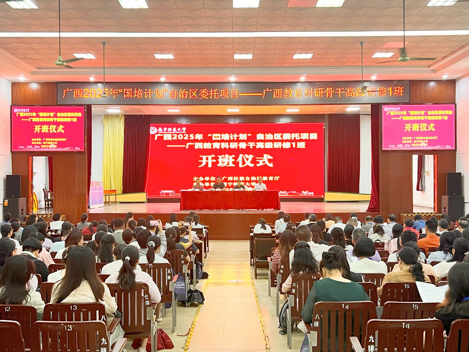 5月24日上午,开班仪式在我校明秀校区会堂举行。广西教育研究院副院长黄玉强出席并致辞,他希望学员珍惜学习机会,将先进理念转化为实践成果,助力广西教育高质量发展。我校教师教育学院院长王文蓉介绍了本次研修的目标与课程安排,表示学校将全力保障研修质量,为学员提供优质学习资源。开班仪式由我校教师教育学院副院长黄明格主持。