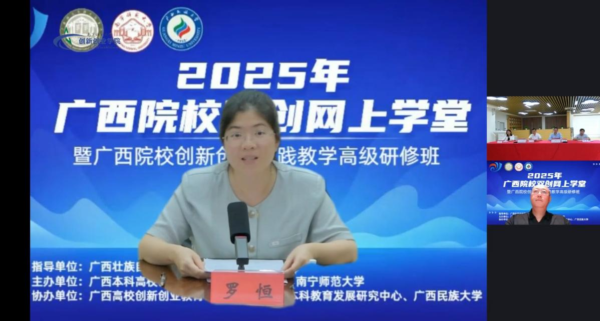 罗恒在开班仪式上线上致辞。她强调,自治区教育厅一贯重视创新创业教育师资队伍建设,自“广西院校双创网上学堂”开办以来,已成为推动我区创新创业教育改革的重要引擎,为各院校搭建了交流互鉴、共同提升的优质平台。众多教师通过这一平台不断更新教育理念、提升教学技能,有力地促进了我区创新创业教育师资队伍的专业化发展。