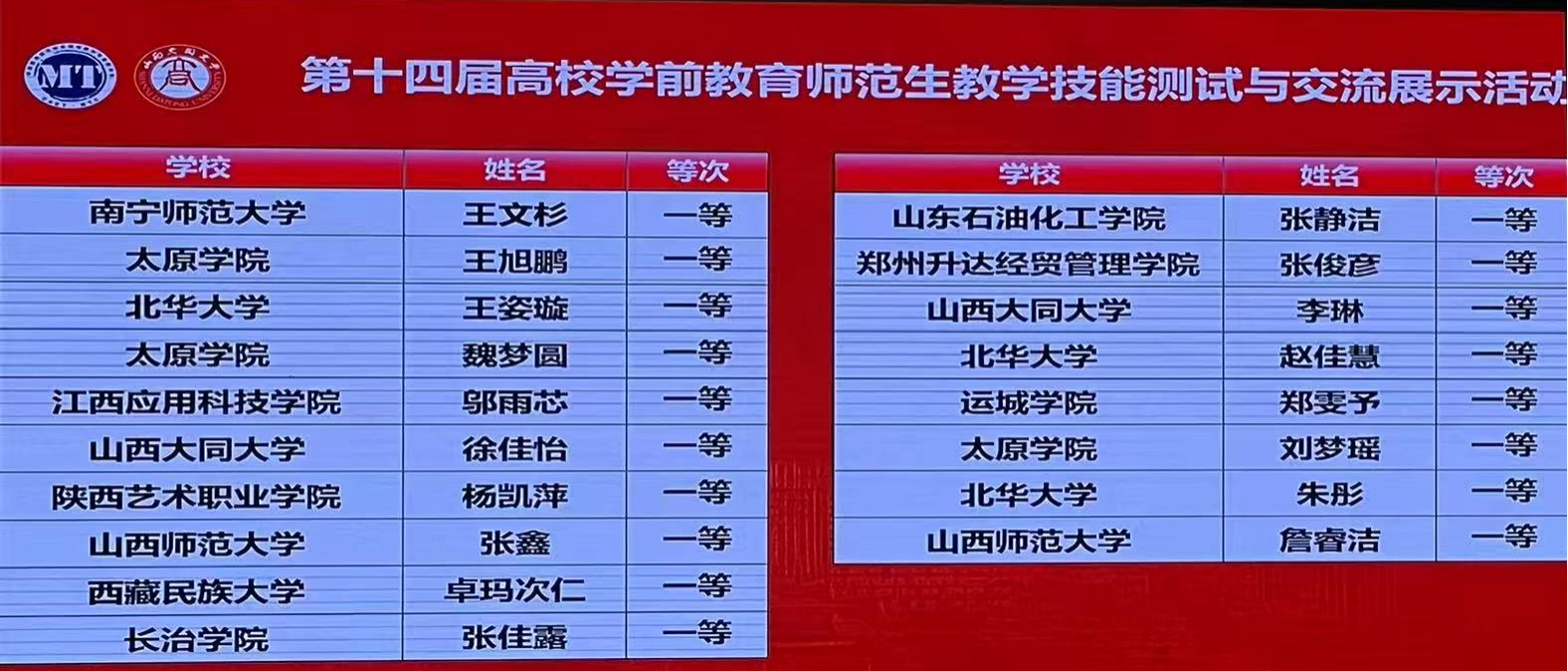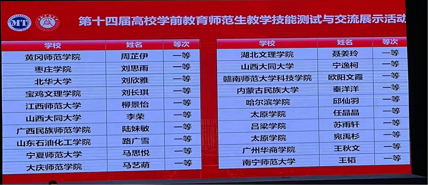 6月6日至9日,由中国教育技术协会微格教学专业委员会主办的“第十四届高校学前教育师范生技能测试与交流展示活动”在山西大同大学举行。我校教育科学学院学前教育系派出王文杉等6名学生参赛,参赛选手经过教学设计评比、现场教学设计思路展示、现场教学展示和专业答辩四个环节的激烈角逐,喜获一等奖2项,二等奖1项,三等奖3项的优异成绩。