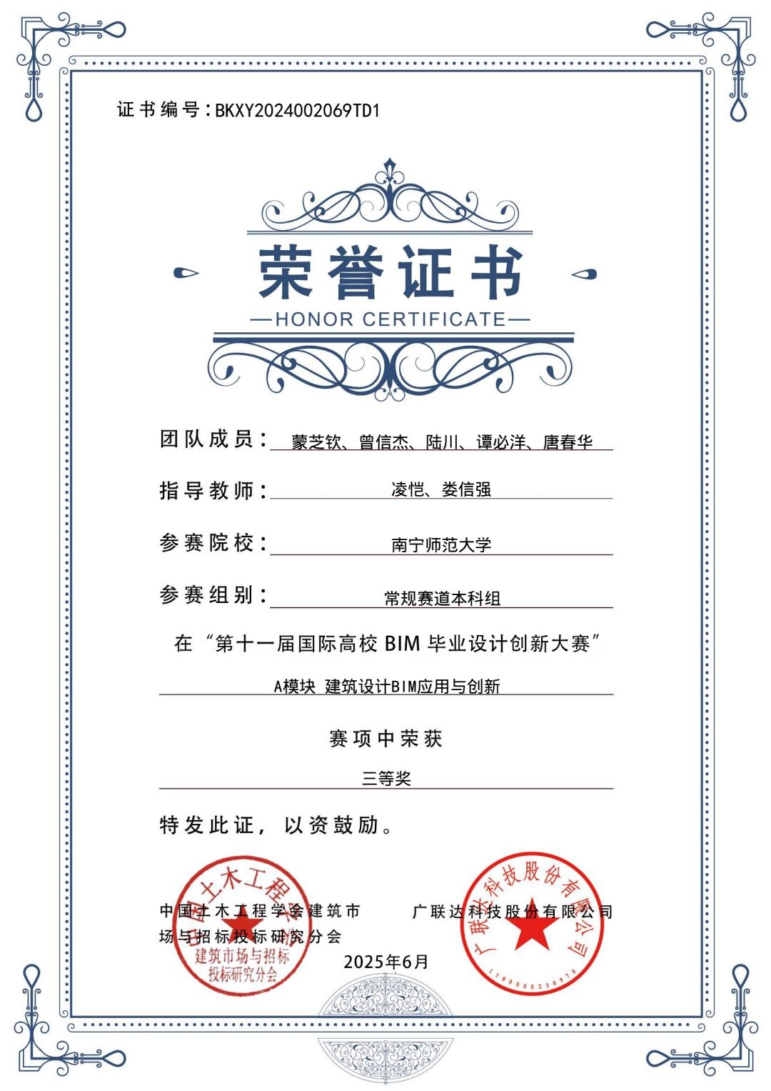 第十一届国际高校BIM毕业设计创新大赛是教育部认证的A类赛事,本次大赛共计报名700余家国内院校,10余家国外院校,14000余支团队,参与师生80000余人,共计提交作品4400余份。学院3支队伍均在此次大赛中表现出色。22级房地产开发与管理专业的陈欣怡、奚经透、谢方冰、黄顺美、宁雪梅等十五位参赛队员利用课余时间仔细研究比赛规则和相关要求,分工明确、各司其职、紧密配合。面对比赛中遇到的困难,他们迎难而上,相互交流、共同探讨,不断对作品进行优化改善。在备赛过程中,凌恺、许杰、娄信强老师对学生们的作品认真地给予指导,定期组织小组会议,优化建模和PPT,以此打磨出高质量的参赛作品。经过长达四个月的精心准备,2025年4月9日,3支队伍在比赛官网提交了最终参赛作品。经过1000余位院校及企业专家进行线上综合评分,学院参赛队伍喜获佳绩。