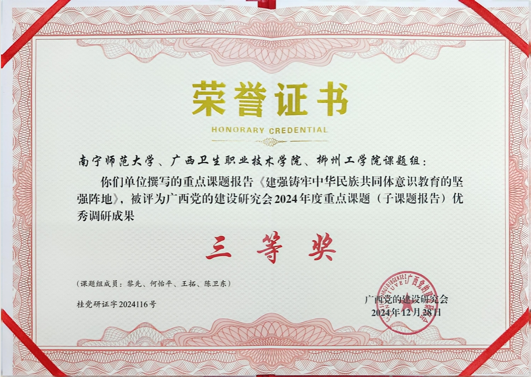 根据广西党的建设研究会《关于通报表扬2024年度重点课题优秀调研成果的通知》,我校自然资源与测绘学院党委书记黎先主持撰写的《建强铸牢中华民族共同体意识教育的坚强阵地》,被评为广西党的建设研究会重点课题(子课题报告)优秀调研成果三等奖,并入选《广西党的建设研究会2024年度重点调研课题优秀成果选编》。
