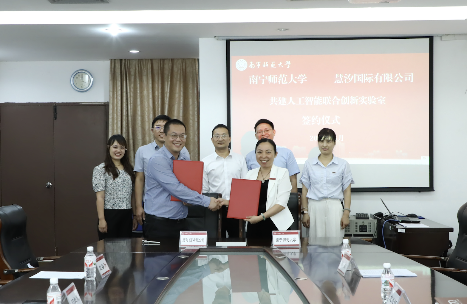 6月30日,我校与入驻中国—东盟人工智能创新合作中心(简称南A中心)的慧汐国际有限公司(老挝)、缅甸GT宽带有限公司在明秀校区举行共建人工智能创新实验室签约仪式。我校副校长龙妮娜,慧汐国际有限公司(老挝)总裁邓良慧、缅甸GT宽带有限公司总经理王鑫、广西南宁大泉井网络信息服务有限公司总经理赵春云以及我校国际交流合作处/国际教育学院、物理与电子学院相关负责人出席仪式。