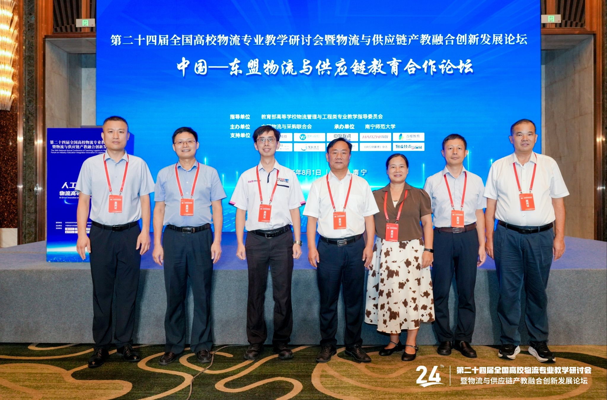 7月31日至8月2日,由教育部高等学校物流管理与工程类专业教学指导委员会指导、中国物流与采购联合会主办、南宁师范大学承办的第二十四届全国高校物流专业教学研讨会暨物流与供应链产教融合创新发展论坛在南宁召开。本届研讨会以“人工智能+物流高等教育创新发展”为主题,汇聚了物流教指委主任、副主任及全体委员,中国物流与采购联合会主要领导,以及来自全国近400所高校、行业企业的领导、专业负责人与骨干教师等,共计1000余位代表参会。广西壮族自治区教育厅副厅长张旭凤、我校党委书记张鹏、校长隆广庆、副校长龙妮娜、副校长卢远等出席大会。
