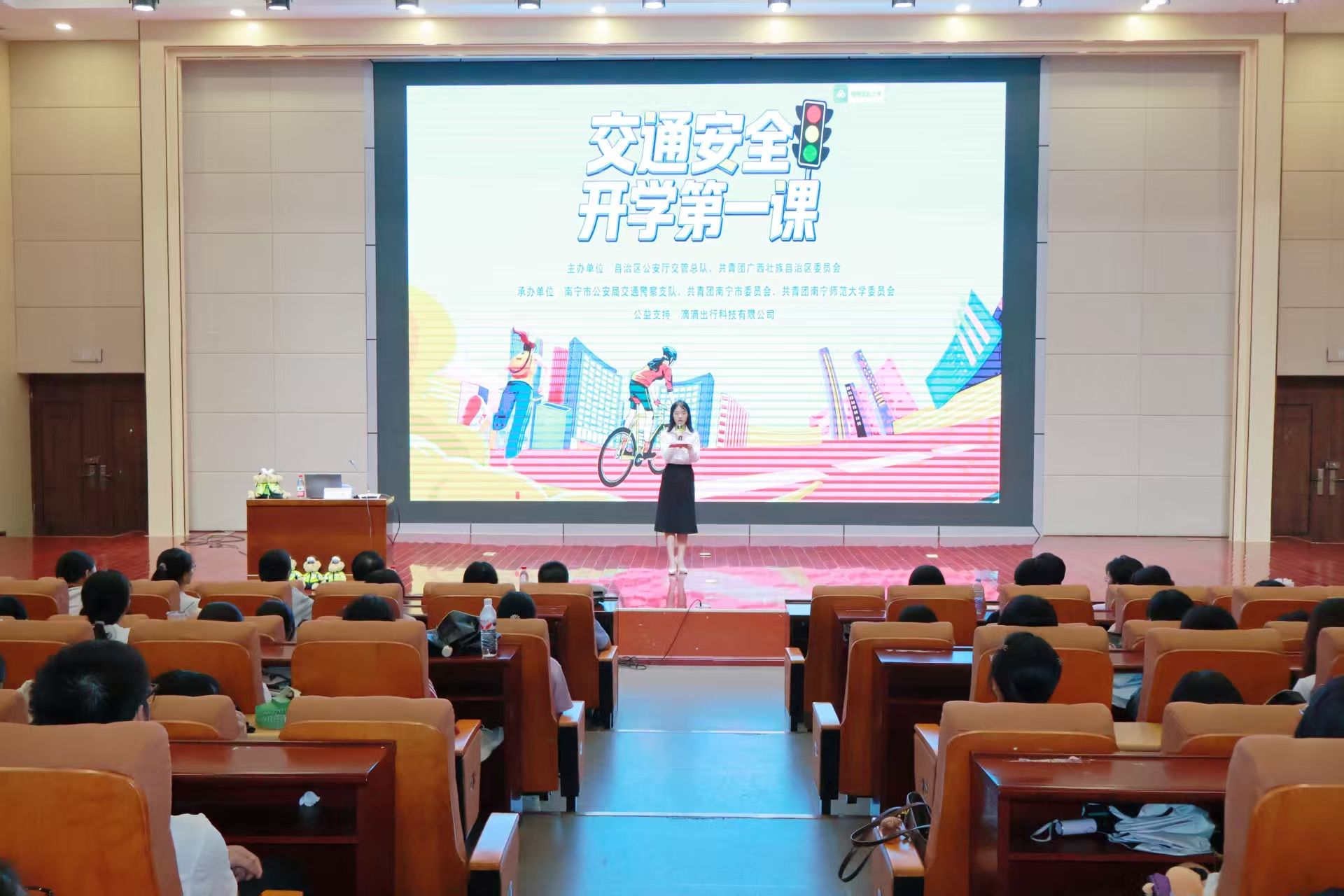 为普及道路交通安全法规,宣传文明交通知识,进一步提升南师学子的交通安全意识。9月24日,由自治区公安厅交通总队、共青团广西区委主办,南宁交警支队、共青团南宁市委、学校团委承办的“交通安全第一课”教育活动在我校五合校区举办,400余名新生代表参加了本次活动。