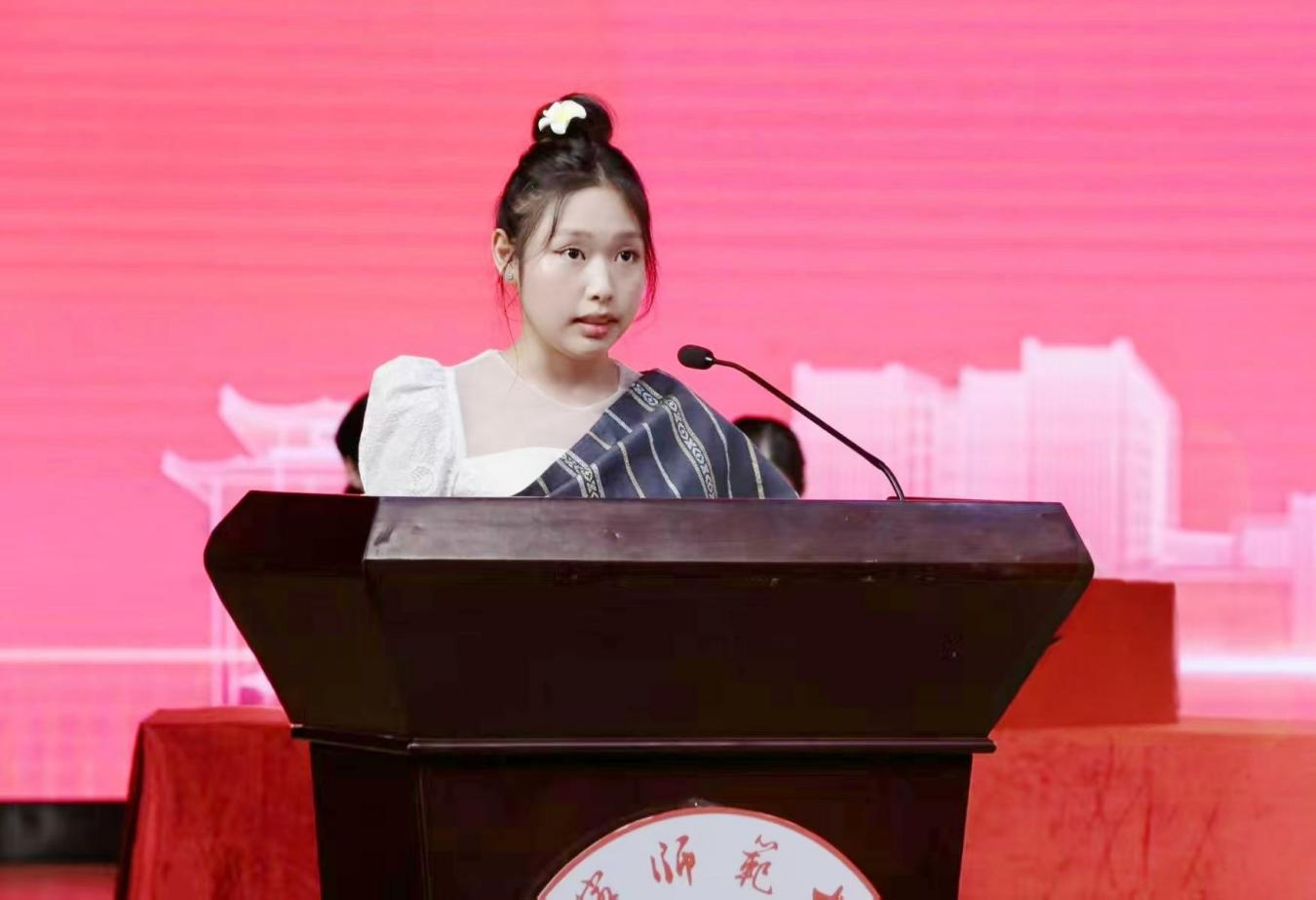 来自老挝的2024级本科生陈玉阳作为老生代表发言,分享了自己在南宁师大的学习经历,鼓励学弟学妹珍惜时光,勇敢面对挑战,以知识为纽带促进中外友谊。