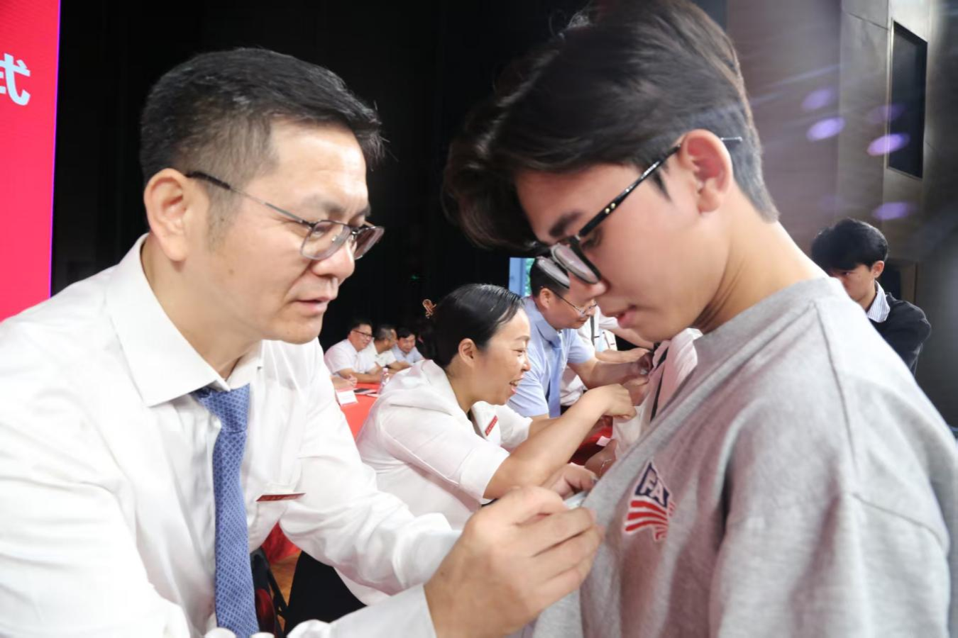 典礼上,前排就座的领导为新生代表佩戴学校徽章。小小的徽章承载着学校的荣誉与期望,标志着新生正式成为“南宁师大人”。典礼在校歌《芳华人间》悠扬的歌声中圆满落幕。