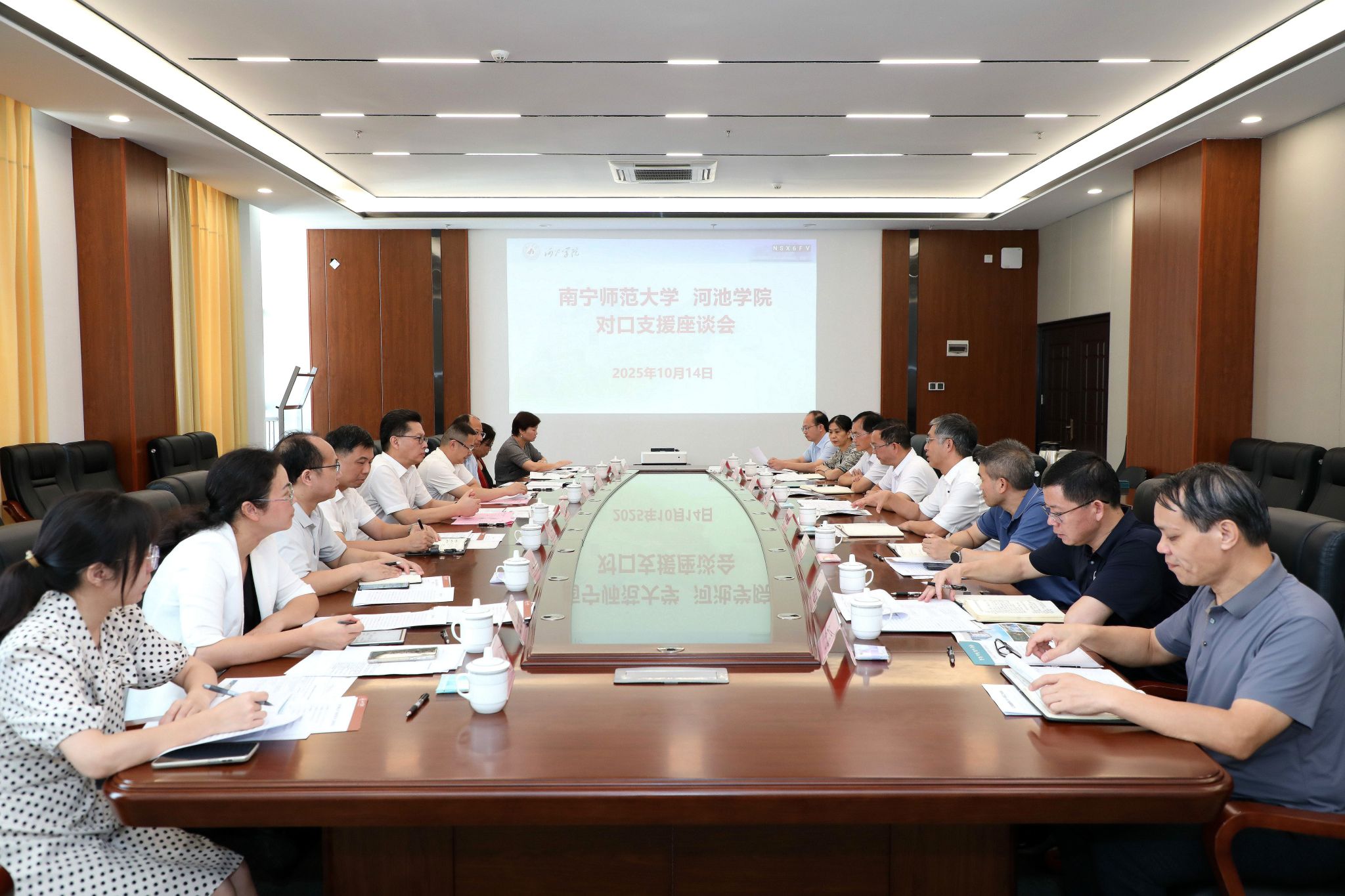 张鹏对河池学院的热情接待表示感谢,并肯定了对口支援工作取得的阶段性成效。他表示,我校与河池学院友谊深厚,两校有相同的师范底色,有相似的发展历程与现实校情,共同构筑了友好合作的坚实基础。他指出,下一阶段的对口支援工作要在精准二字上再下功夫、在机制建设上再求突破、在创新合作上再开新局,坚持互学共鉴,相互启发、彼此赋能、共同进步,开创合作共赢新局面。