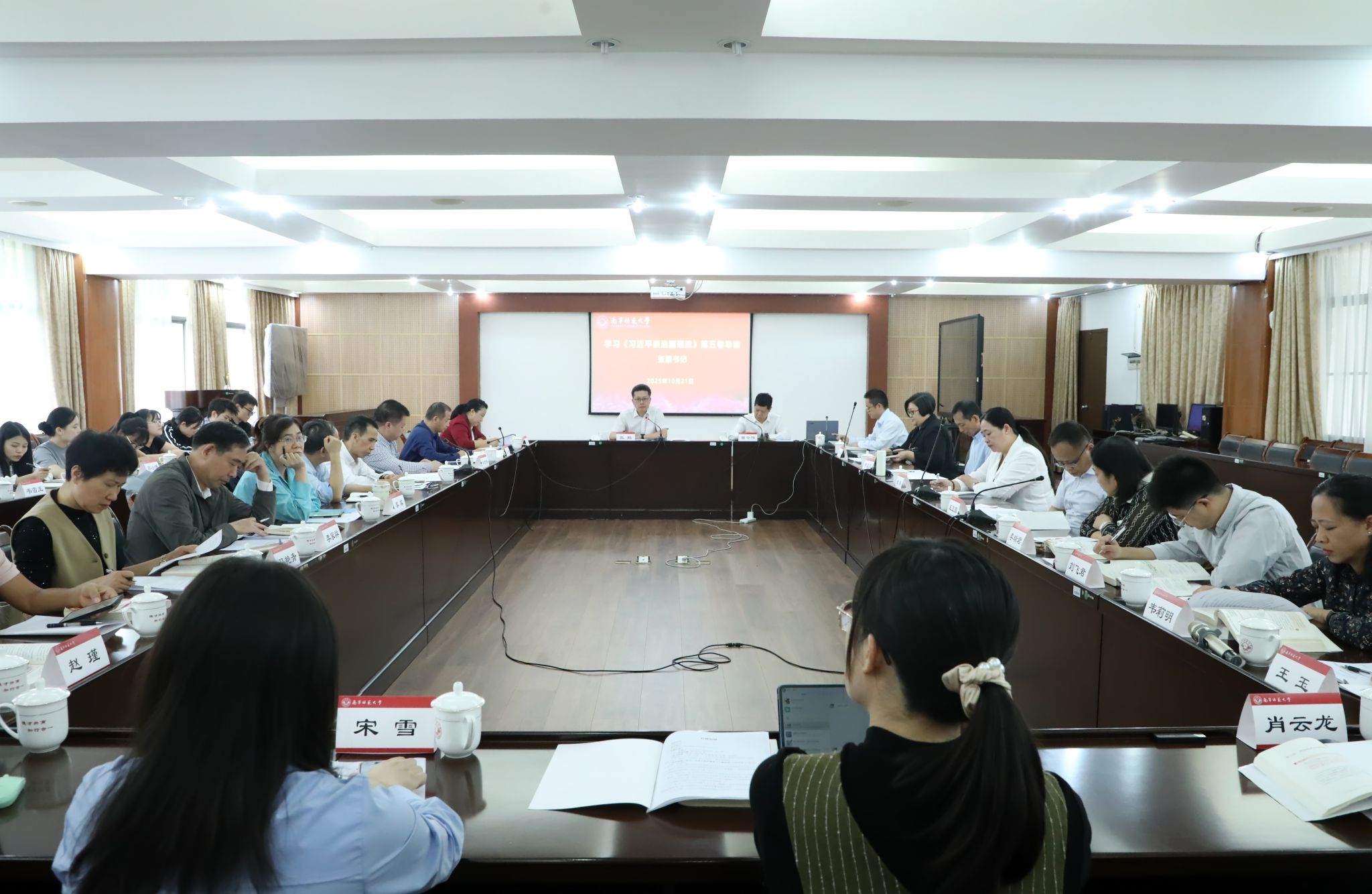 10月21日,我校在明秀校区鸿远楼409会议室举行了《习近平谈治国理政》第五卷学习会暨思政课集体备课会。学校党委书记、广西马克思主义理论研究和建设工程南宁师范大学研究基地(下称“马基地”)主任张鹏出席会议。马基地主要人员,初等教育学院、教育科学学院、经济与管理学院和新闻与传播学院的有关负责同志,马克思主义学院领导班子以及研究生代表等30余人参加会议。会议由马克思主义学院院长曾令辉主持。