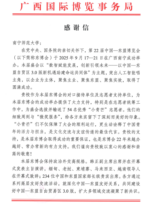 近日,我校收到广西国际博览事务局发来的感谢信,对我校作为第22届中国—东盟博览会(以下简称东博会)的对口接待单位和志愿者支持单位,为其成功举办提供了大力支持表示衷心的感谢,特别是为盛会选拔并输送了54名优秀“小青芒”志愿者。