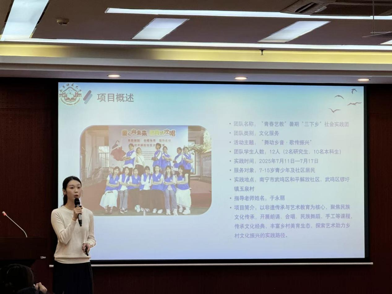 今年暑期,我校积极响应号召,围绕乡村振兴、理论宣讲、文化传承、AI赋能等主题,组建了31支团队700余名师生分赴贵州、桂林、柳州、河池、崇左等都地区开展暑期“三下乡”社会实践,其中5支暑期“三下乡”社会实践团队入选全区重点团队。评选会上,各实践团队从团队介绍、活动开展详情、实践成果展示及宣传报道等多方面,通过PPT演示与纪实视频相结合的方式进行详细介绍,充分展现各实践团队的特色和亮点。评委们根据各团队的展示情况,从实践内容的创新性、实效性、团队协作能力以及社会影响力等进行综合评审打分。同时,评委们结合各团队表现逐一点评,并提出要求:希望各团队在今后社会实践中践行“敢想、敢做、会说”,推动暑期“三下乡”活动不断往深里走、往实里走、往长期走;将社会实践与品牌项目打造紧密结合,进一步做好文化推广、树立特色实践品牌。