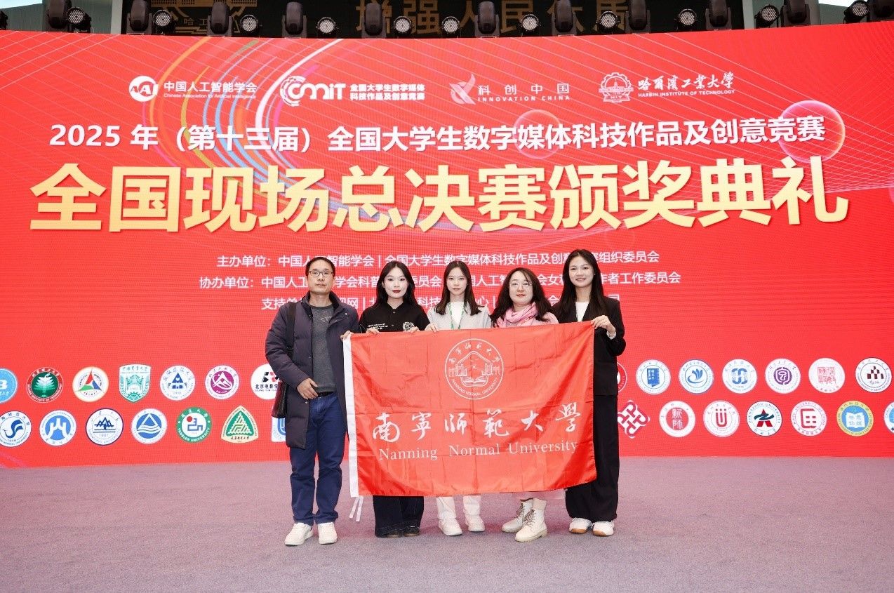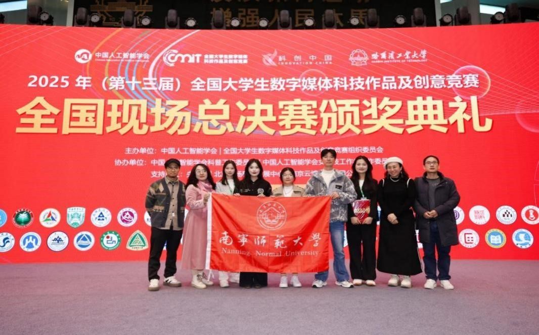 近日,2025年度第十三届全国大学生数字媒体科技作品及创意竞赛全国总决赛在哈尔滨工业大学举行。我校入围全国现场总决赛的5个学生作品中,获得全国一等奖2项、全国二等奖3项荣誉,刷新我校在本赛事中的获奖记录。其中,职业技术师范学院黄飞梅、韦晓慧创作的《一叶知六堡》(指导老师:职业技术师范学院张丽娜)、杨紫媚同学创作的《MC纪元之三诛白骨》(指导老师:职业技术师范学院张丽娜、韦慧)在大赛中脱颖而出,荣获2项全国二等奖。