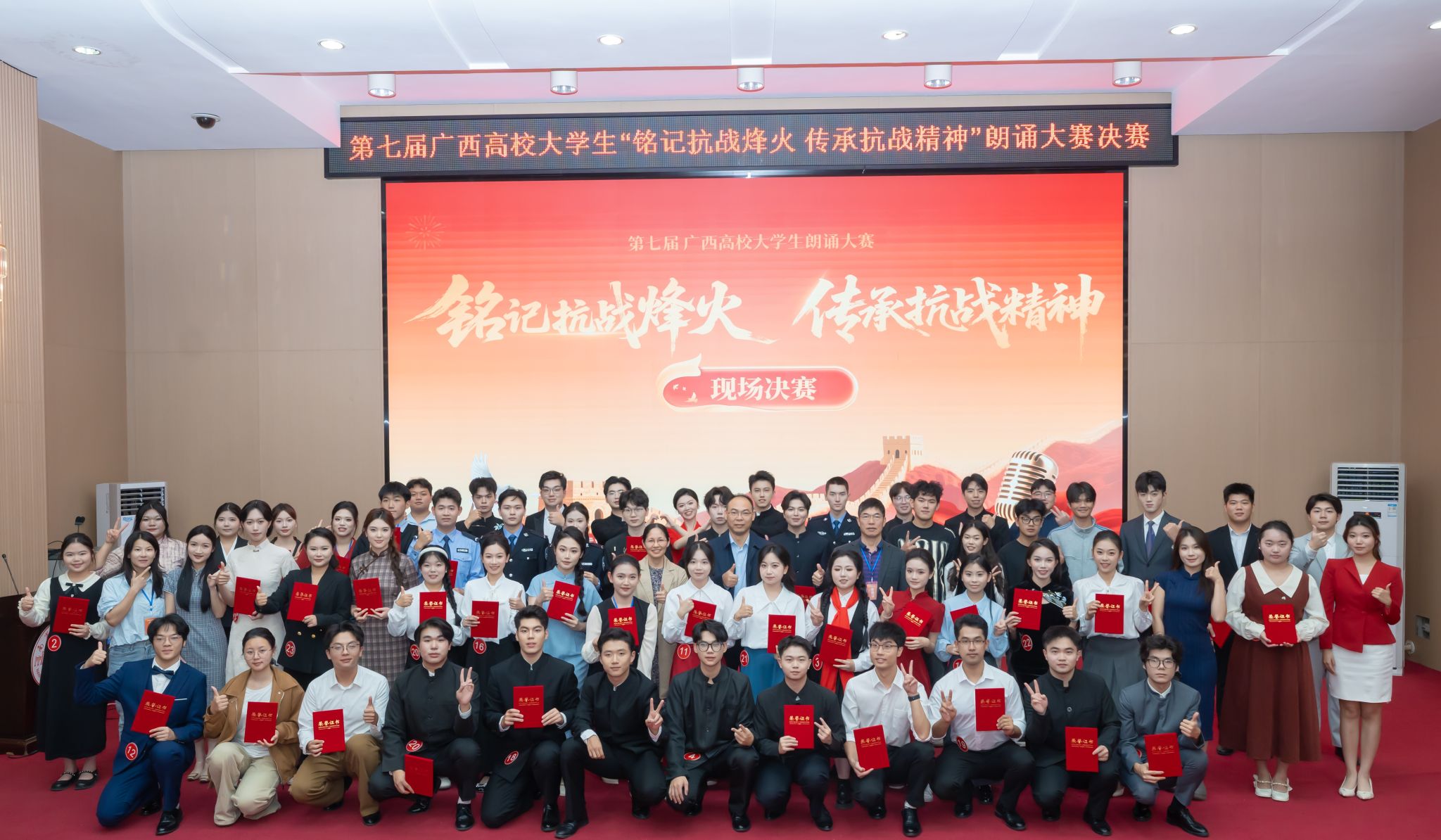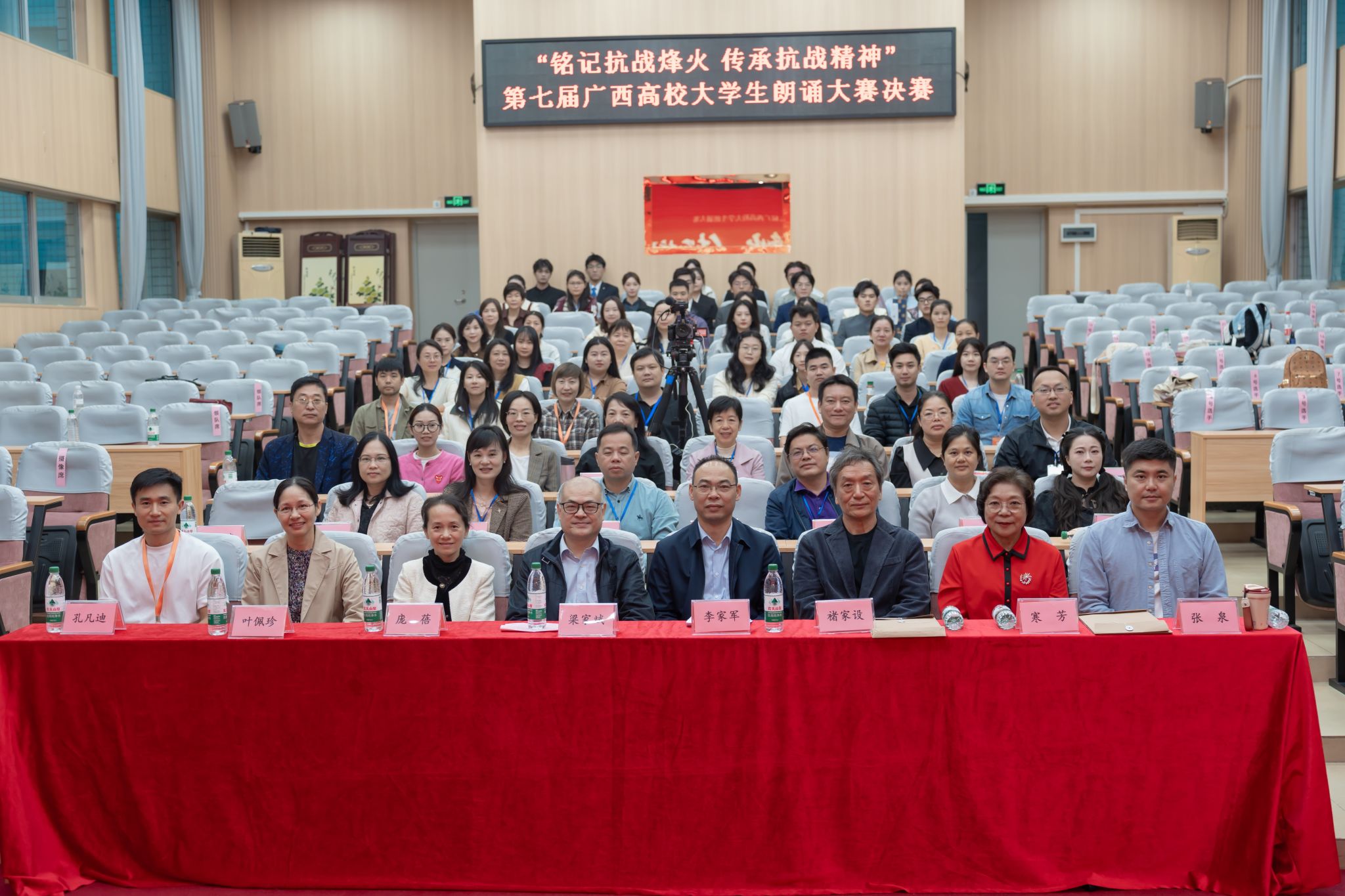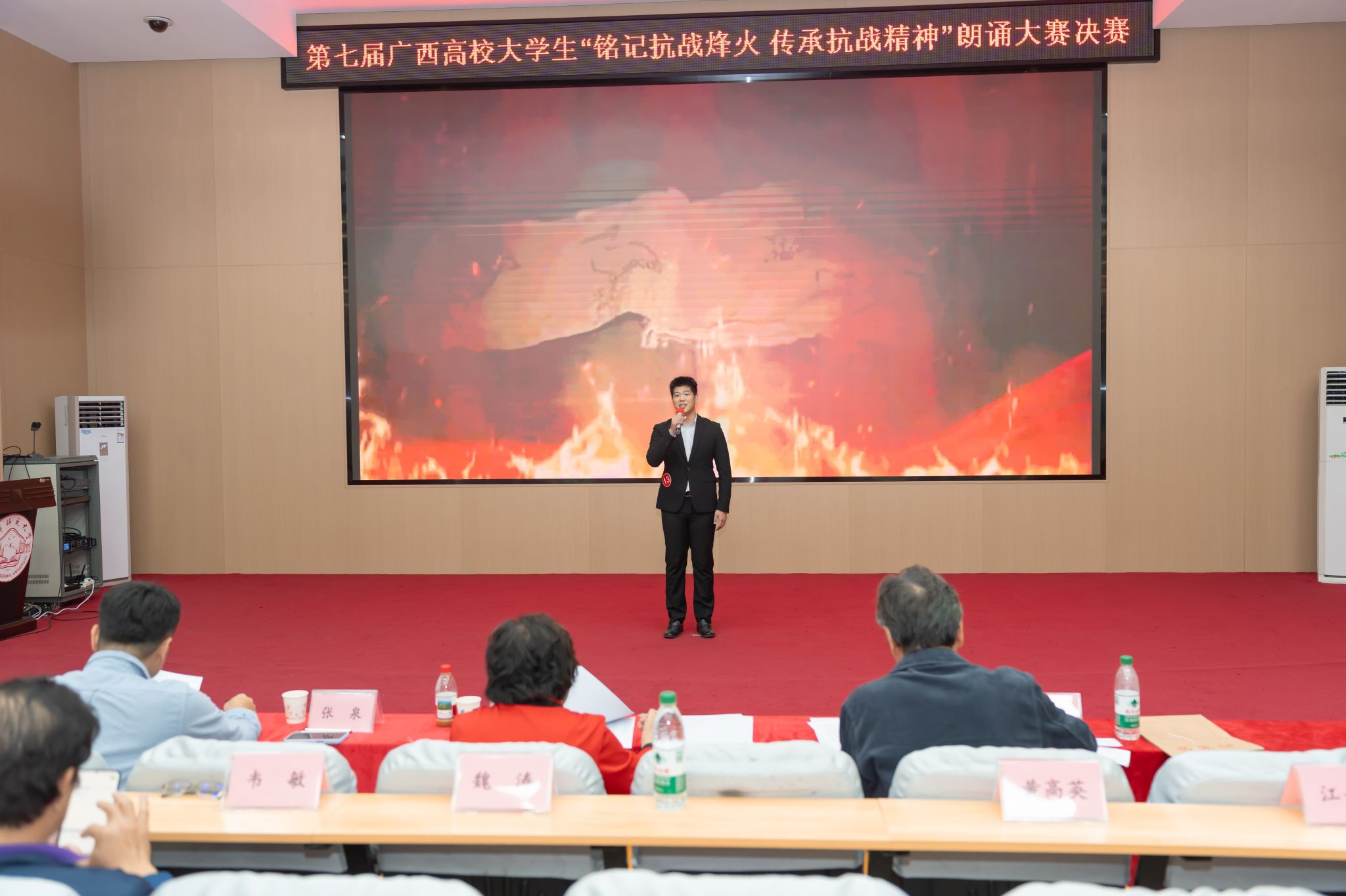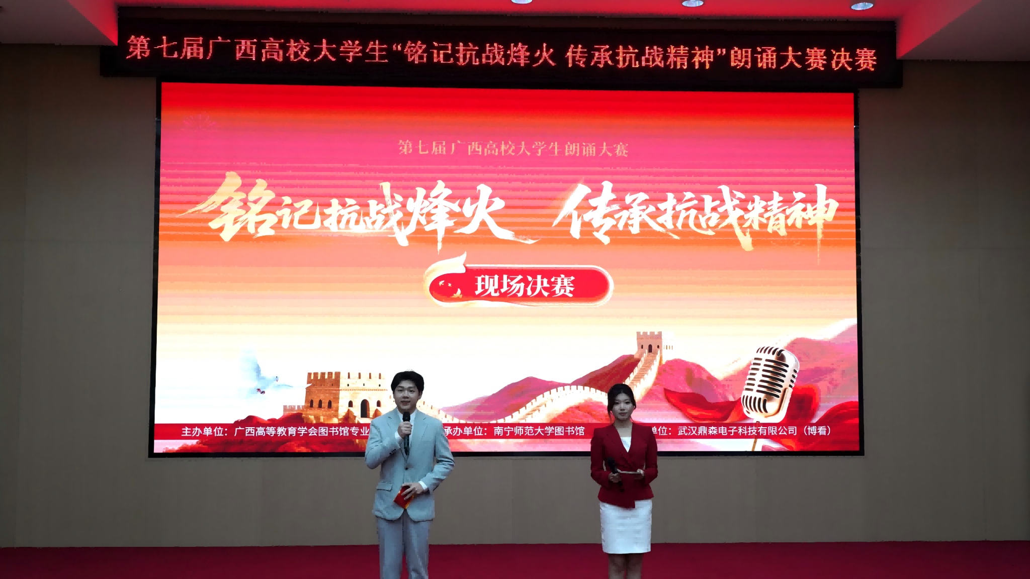 为纪念中国人民抗日战争暨世界反法西斯战争胜利80周年,弘扬伟大抗战精神,推动爱国主义教育走深走实。11月16日,由广西高等教育学会图书馆专业委员会主办、我校图书馆承办、武汉鼎森电子科技有限公司(博看)协办的第七届广西高校大学生“铭记抗战烽火 传承抗战精神”朗诵大赛决赛在我校明秀校区成功举办。学校总会计师梁家斌,广西高等教育学会图书馆专业委员会理事长、广西大学图书馆馆长李家军出席开幕式并致辞。开幕式由我校图书馆馆长叶佩珍主持。来自全区37所高校共150余名师生集聚决赛现场。