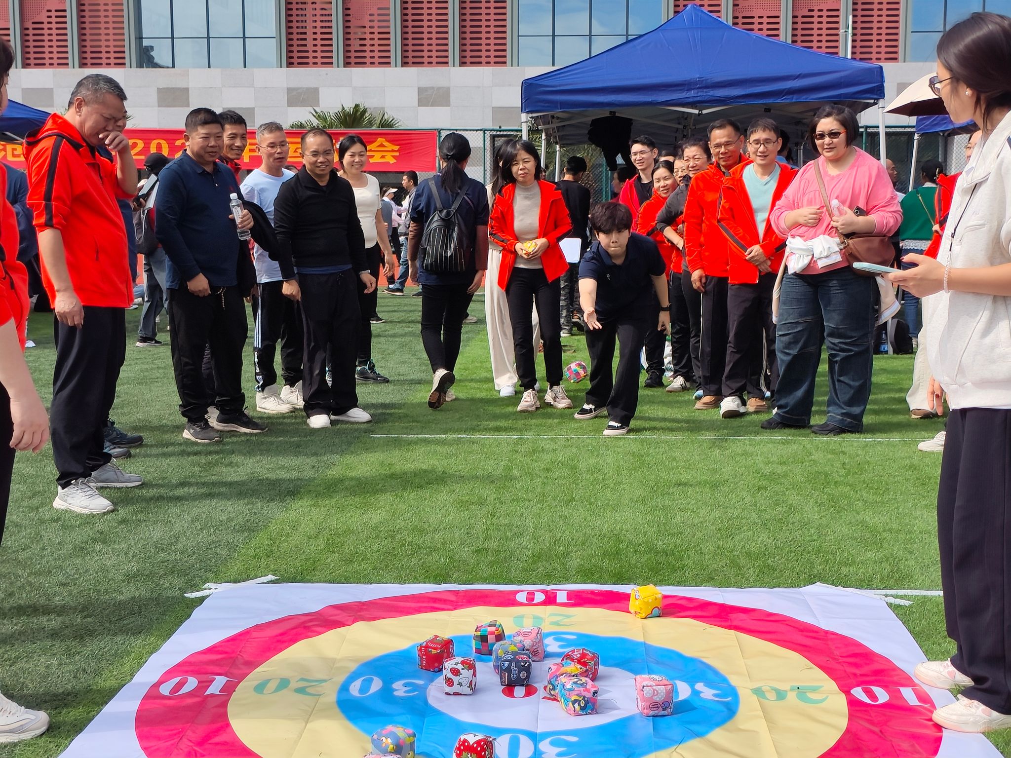参赛者在指定投掷线后投掷沙包,按落点区域计分。学工团委工会、国内合作师园联合工会队伍凭借精准投掷夺得冠军。