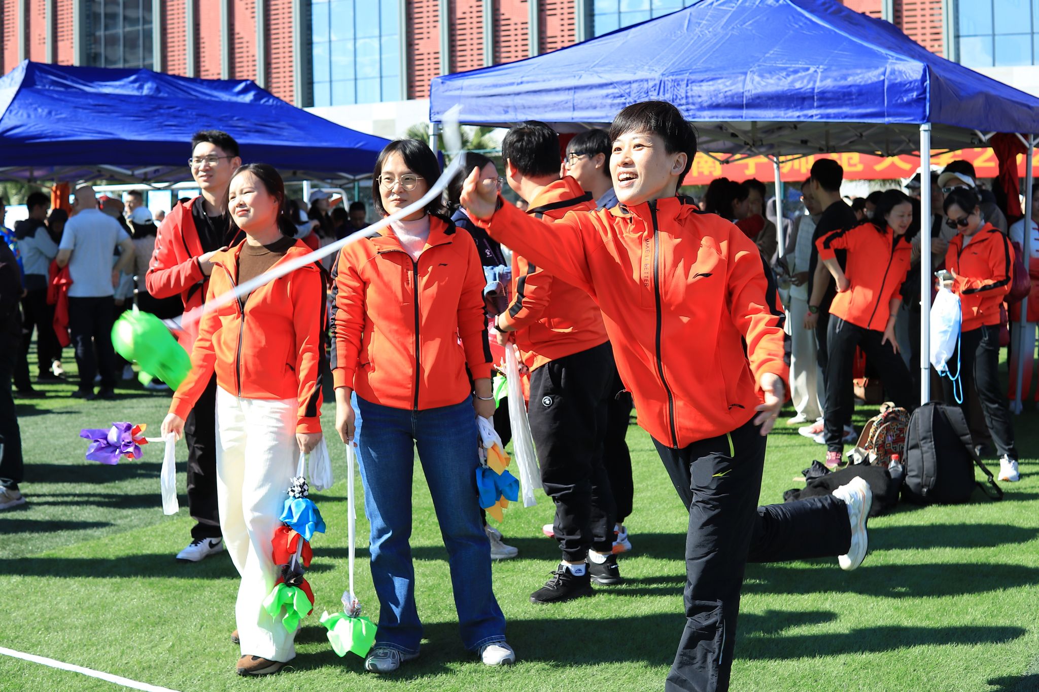 11月20日,我校2025年教职工趣味运动会在武鸣校区兰园体育场顺利举行,来自37个分工会的教职工踊跃参与,现场气氛热烈。本次运动会设置了“团体欢乐跳绳”“沙包投掷”“筷子夹球”“四平八稳”“一圈到底”“抛绣球”“鼓动人心”等多项趣味集体项目,展现了教职工团结协作、积极向上的精神风貌。