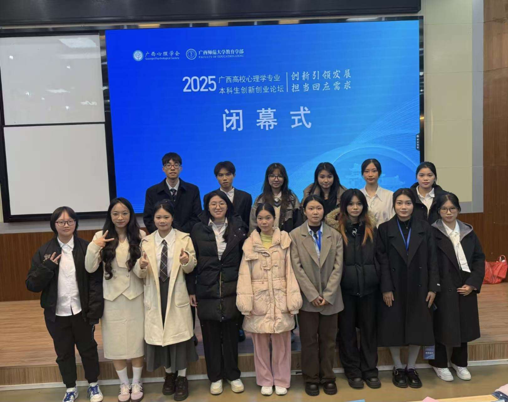 12月14日,由广西心理学会、广西壮族自治区教育厅广西本科高校心理学类教学指导委员会主办,广西师范大学教育学部心理学系、广西师范大学心理学拔尖学生培养基地、广西认知科学与心理健康重点实验室联合承办的“2025年广西高校心理学专业本科生创新创业论坛”在广西师范大学育才校区顺利举行。我校教育科学学院学子获佳绩:在教学技能分论坛奖项方面,于跃获一等奖,王子菲、罗永嘉获二等奖,陈丽娜获三等奖;在心理学产品设计分论坛奖项方面,俞一凡团队获二等奖,张曦月团队、兰悦月团队、高雅团队获三等奖;甘百敏团队、杨璐团队获现实问题解决分论坛二等奖;李思雨,罗梓函获心理实验设计分论坛三等奖;韦纯港团队、黄薇团队获心理科普短视频赛道二等奖。