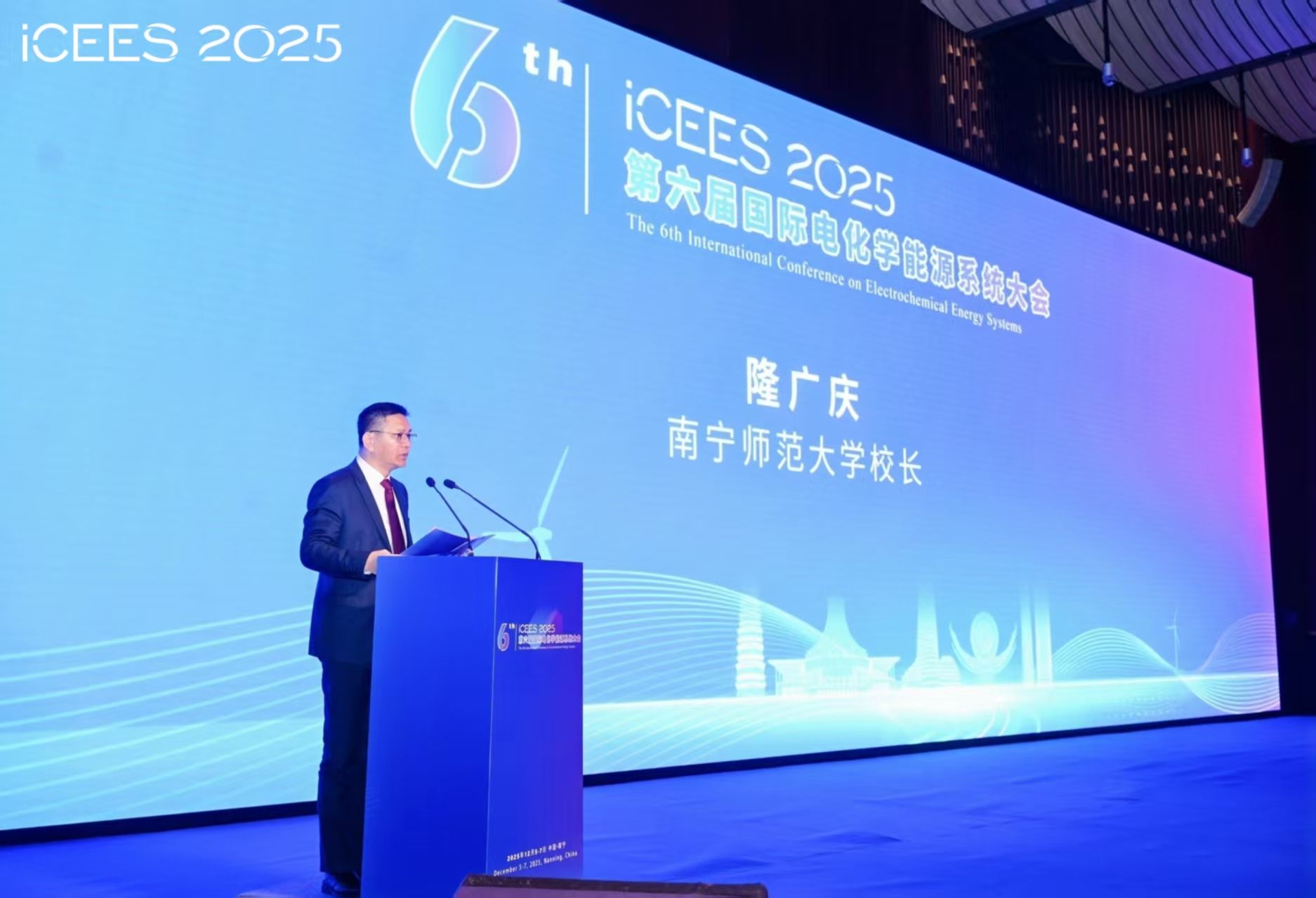 12月5日至7日,第六届国际电化学能源系统大会(ICEES2025)在南宁顺利召开。本次会议由上海交通大学绍兴新能源与分子工程研究院、南宁师范大学等单位联合主办,我校化学与材料学院、广西天然高分子化学与物理重点实验室等机构共同承办。大会邀请了赵天寿、陈国华、林文锋、骆静利四位院士在内的近30名知名学者作报告。我校校长隆广庆出席大会并致辞。