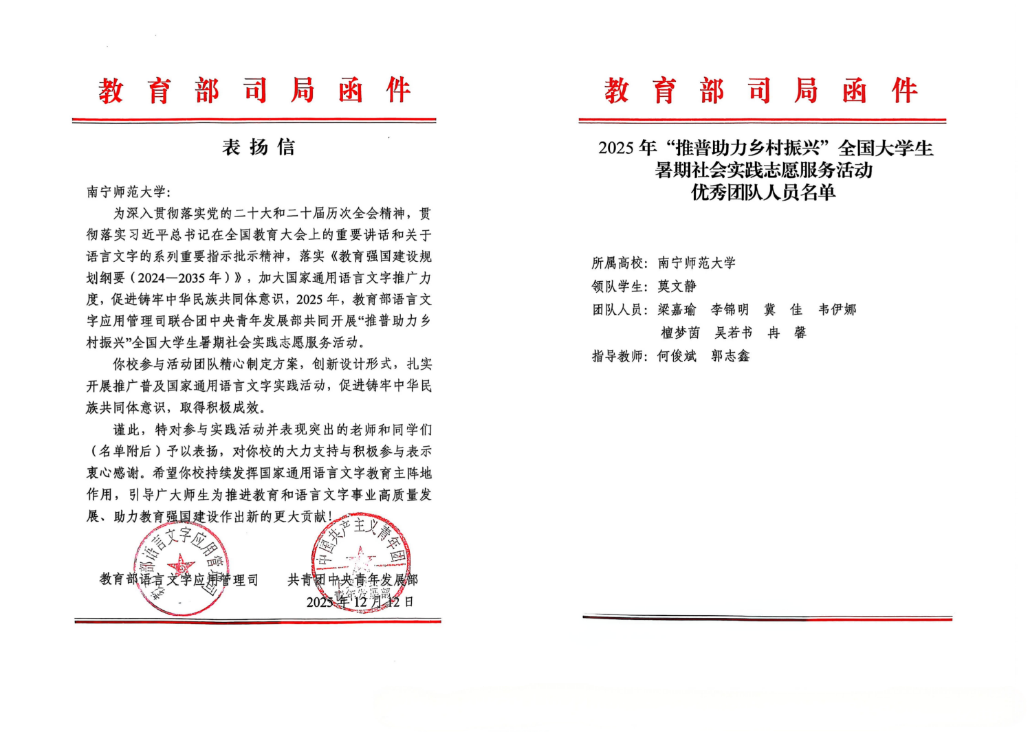 近日,教育部语言文字应用管理司、共青团中央青年发展部向我校发来表扬信,对我校积极组织师生参与2025年“推普助力乡村振兴”全国大学生暑期社会实践服务活动的积极成效予以肯定和表扬。其中我校青年志愿者联合会牵头组建的“助力乡村推普传声,聚力青春共赴新程”实践团从众多实践团队中脱颖而出,获评“全国优秀团队”,展现了扎实的组织能力与显著的实践成效。
