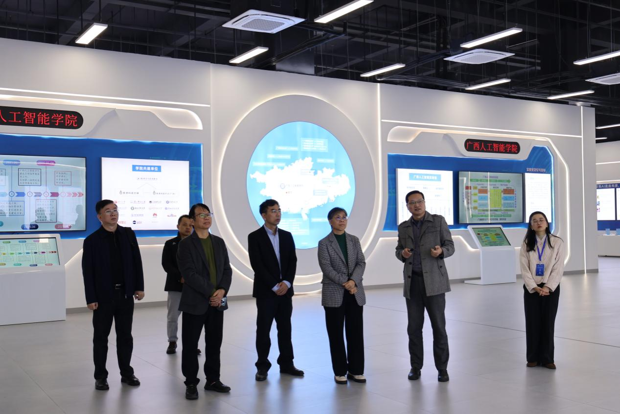 杨巨成带领李美清一行实地参观了广西人工智能学院人工智能展厅,通过实物演示、案例讲解、数据呈现等方式,详细介绍了广西人工智能学院在人才培养体系构建、核心技术研发攻关、产学研协同创新、产业孵化赋能等方面的建设成果与发展规划。