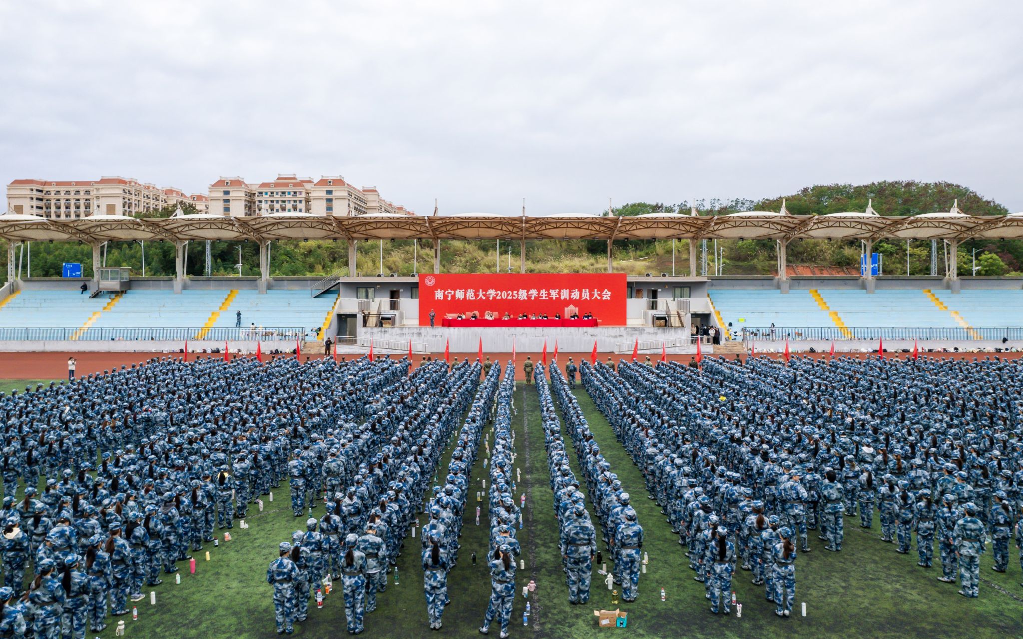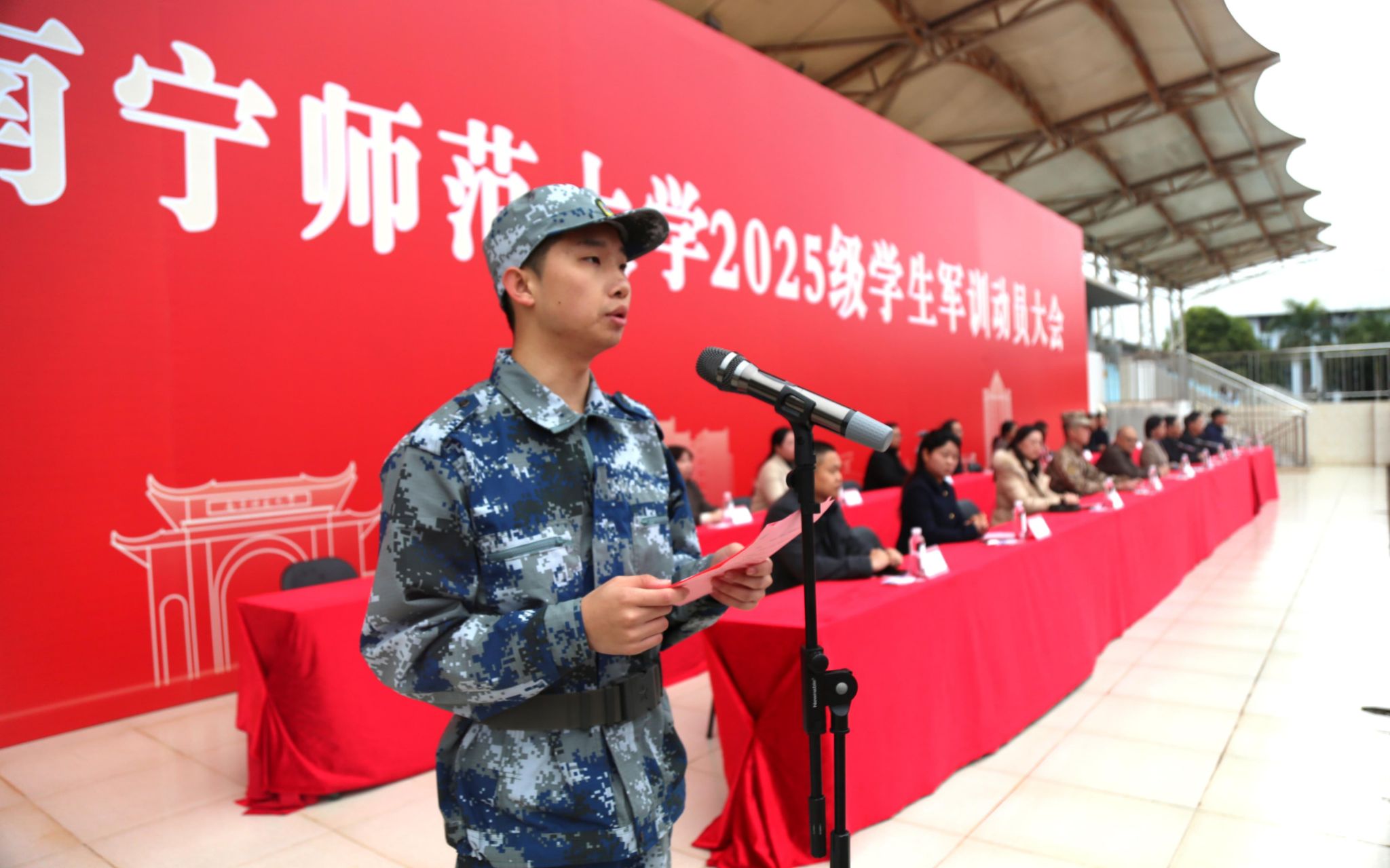 1月5日上午,我校2025级学生军训动员大会在五合校区和武鸣校区同时举行。学校副校长梁家斌、龙妮娜,承训单位代表,学校相关职能部门、教辅部门、各学院负责人以及2025级6482名军训学生参加大会。