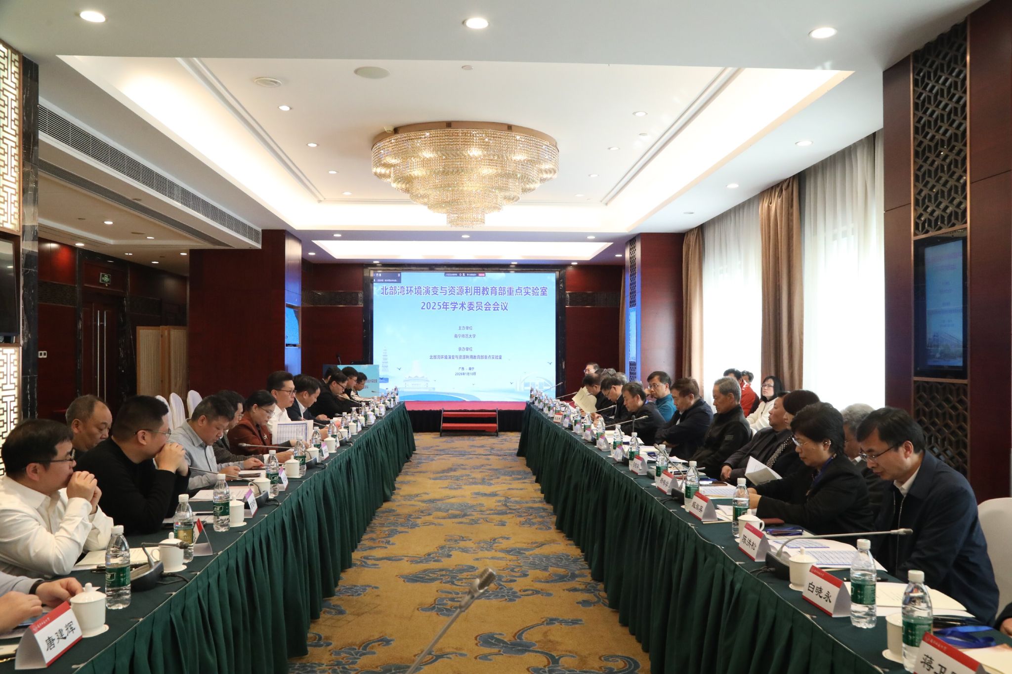 1月10日,北部湾环境演变与资源利用教育部重点实验室2025年学术委员会会议在南宁红林大酒店举行,来自中国科学院、中国地理学会、北京大学、北京师范大学、南京大学、华东师范大学、兰州大学、华南师范大学等三十多家科研机构的院士、教授及特邀专家通过线上线下融合方式齐聚一堂,共商实验室发展大计。我校党委书记张鹏出席开幕式并致辞,开幕式由我校副校长卢远主持。