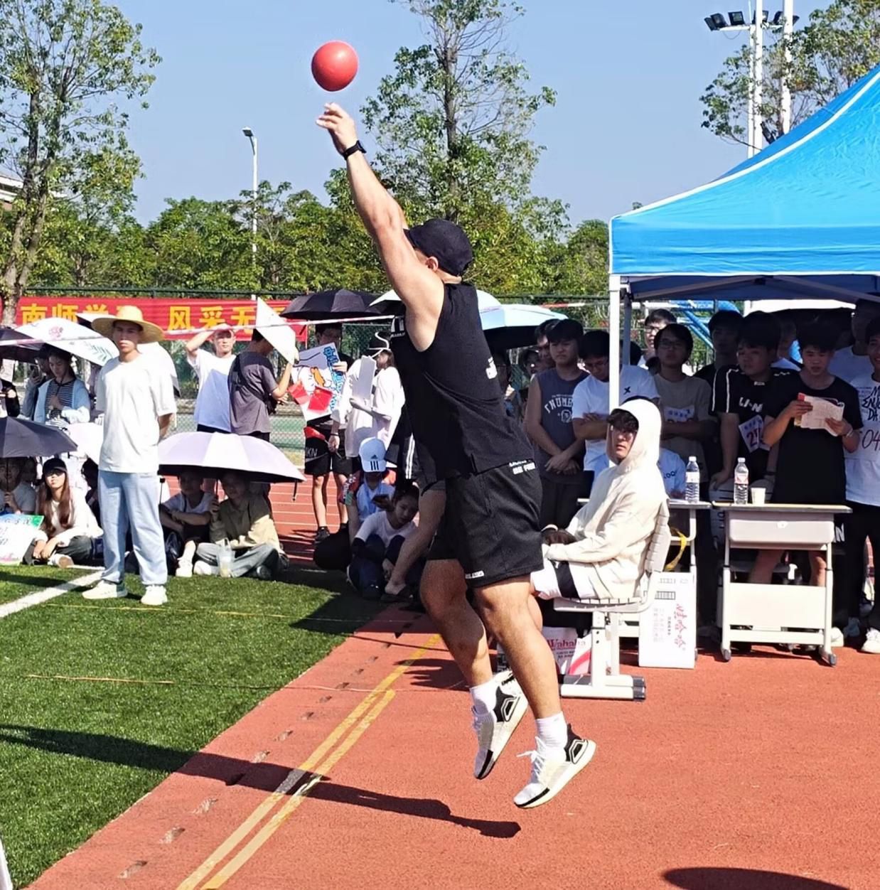 赛前,参赛选手们个个摩拳擦掌,蓄势待发,积极地做着热身运动。 随着裁判员那铿锵有力的一声令下,决赛的大幕正式拉开。只见参赛选手们猛地迈开左脚,整个上半身优雅而充满力量地向后仰去,他们的右脚稳稳地蹬在地板上,重心下沉,身体后倾,借助腰的力量,双手紧握实心球奋力向前抛。投掷实心球的那一瞬间,选手们仿佛化身为力量的使者,将全身的力量倾注在这一次挥洒中。一道优美的抛物线划过半空,掷地有声地落在了草坪上,闪耀着青春的光芒。“加油加油!”现场的观众热情如火,欢呼声、加油声此起彼伏,响彻云霄,整个赛场充满了青春的活力和激情的碰撞。