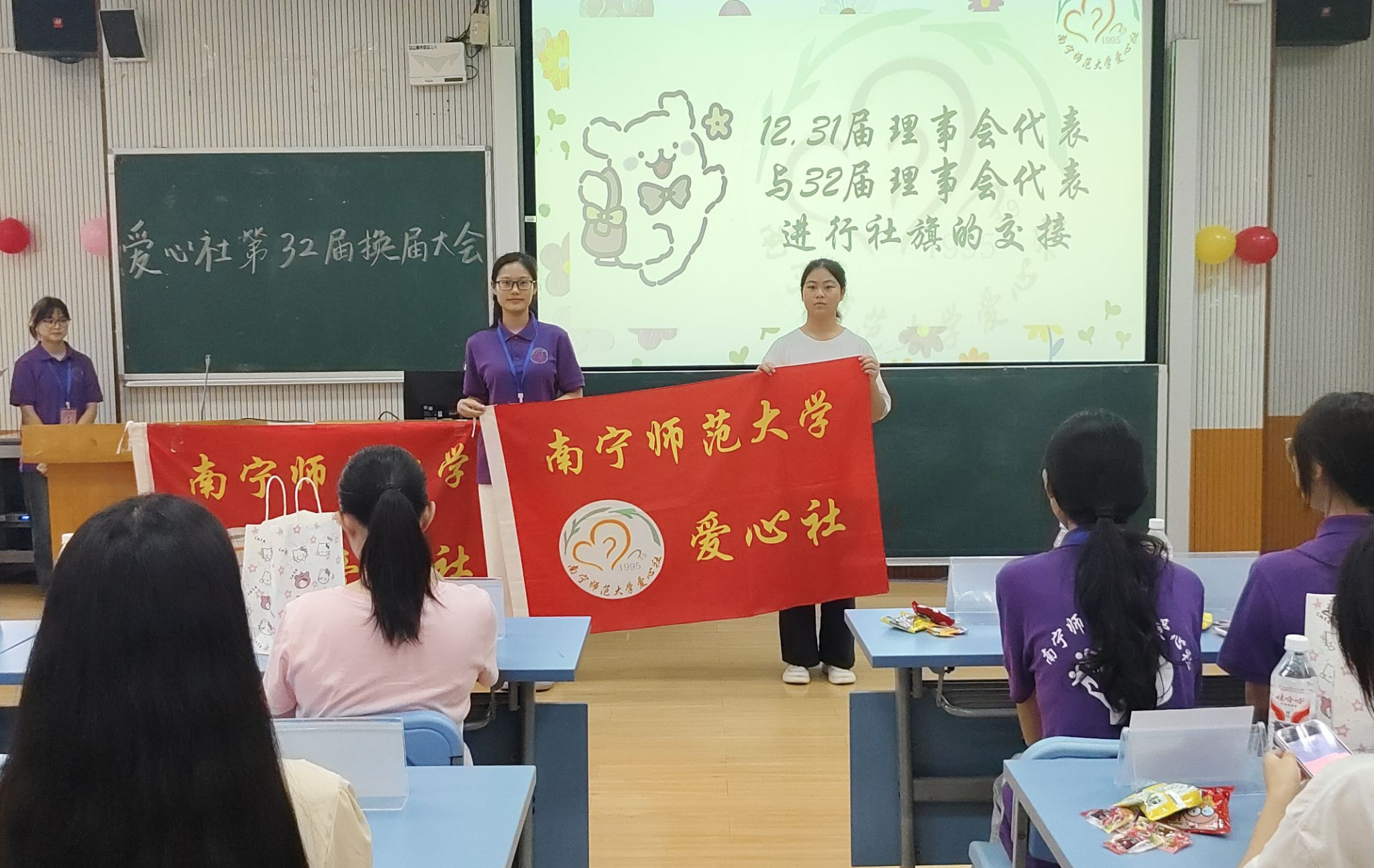31 届副会长宣布新一任工作人员名单后,各部门新旧部长依次发言。在核心环节 —— 社旗交接仪式中,31 届理事会代表将社旗郑重交予 32 届社长,红色社旗的传递象征爱心事业的延续。新任理事会代表对下一学年志愿服务计划进行发言,全体志愿者庄严宣誓。