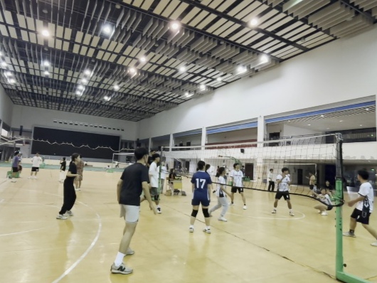 阳光透过体育馆顶部的玻璃,洒在排球场上。我们分成两队,展开一场活力对决。发球手后退几步,助跑、挥臂,球如炮弹般飞过球网。对面的朋友迅速垫球,球稳稳飞起。攻手瞅准时机,高高跃起扣杀,球带着风声砸向地面,一片欢呼喝彩声在体育馆内不断回荡。
