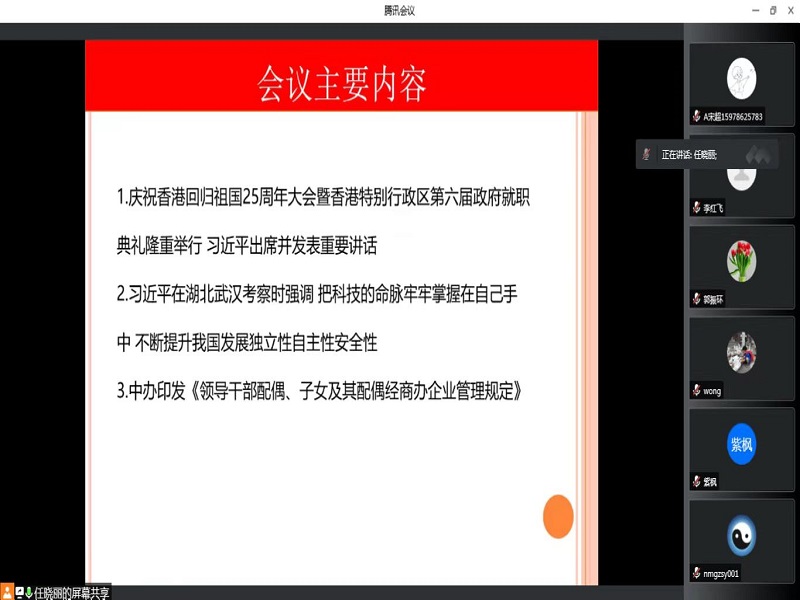 此次主题党日活动各党支部首先集中学习了习近平总书记在庆祝香港回归祖国25周年大会暨香港特别行政区第六届政府就职典礼上发表的重要讲话。会上,教工第四党支部党员汪洋同志表示,要深入领会习近平总书记重要讲话的丰富内涵、精神实质、实践要求,坚决按照总书记指引的方向走好新的赶考之路;要牢牢扛起疫情防控这个首要政治任务,抓紧抓实抓细抓严疫情防控的“四个责任”;要强化底线意识,以“时时放心不下”的责任感做好学生工作,以实际行动迎接党的二十大胜利召开。随后,各个党支部领学了习近平总书记在湖北武汉考察时重要讲话精神,以及《领导干部配偶、子女及其配偶经商办企业管理规定》。