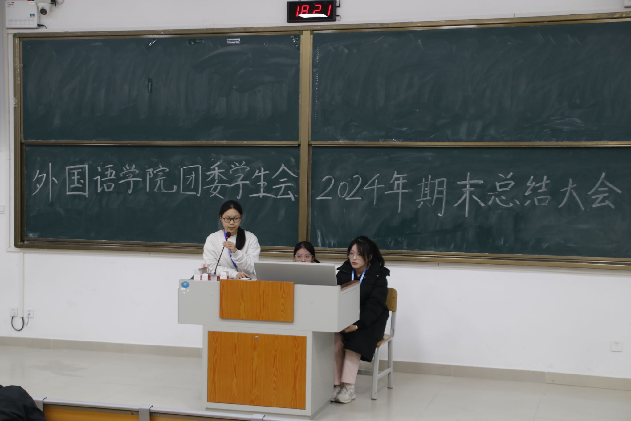 2024年12月24日晚,外国语学院于武鸣校区实验楼2-B108教室召开团委学生会本学期期末总结大会。学院党委副书记刘晖晖、学工办蔡梓晴老师、古东燕老师、团副主席团成员以及团委学生会全体成员们出席本次会议。