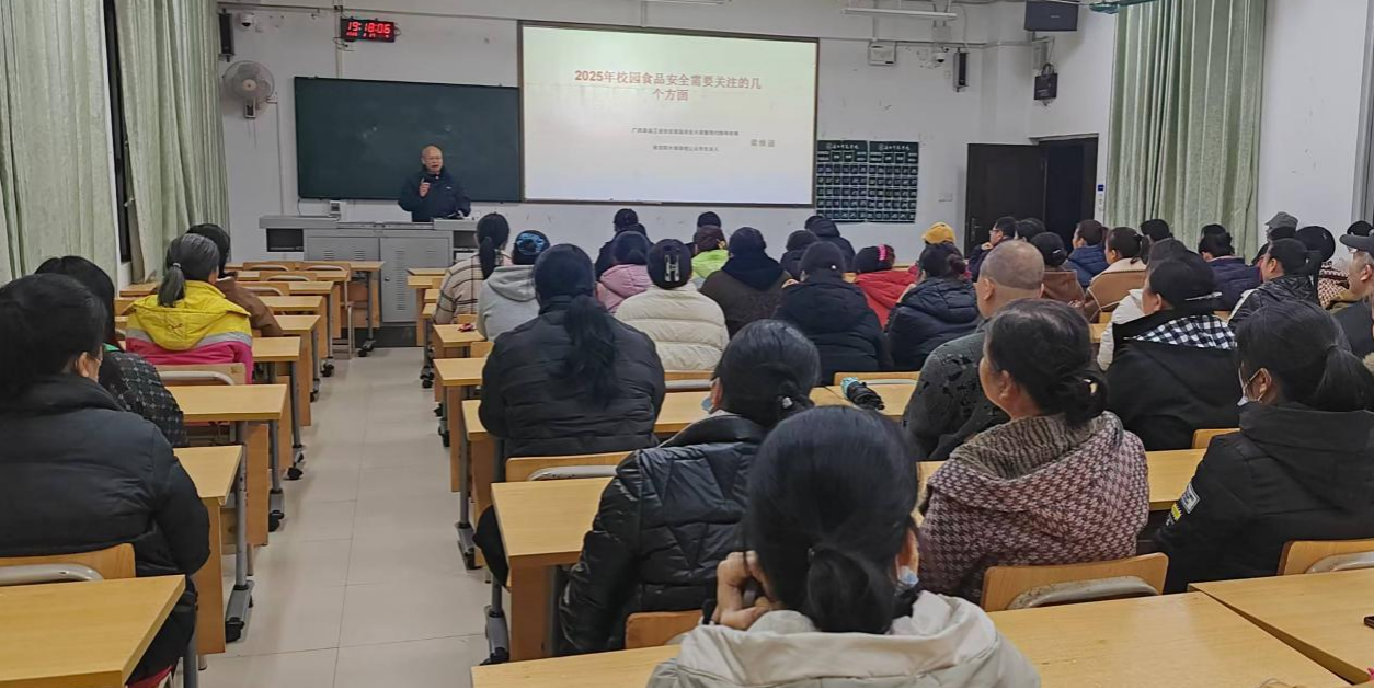 为加强校园食品安全保障,讲好“开学第一课”,2025年春季学期开学第一周,我校后勤基建处邀请南宁市食品安全社会监督员梁维运为食堂从业人员开展专项培训。培训分别在明秀、五合、武鸣三个校区进行,共培训从业人员344人。