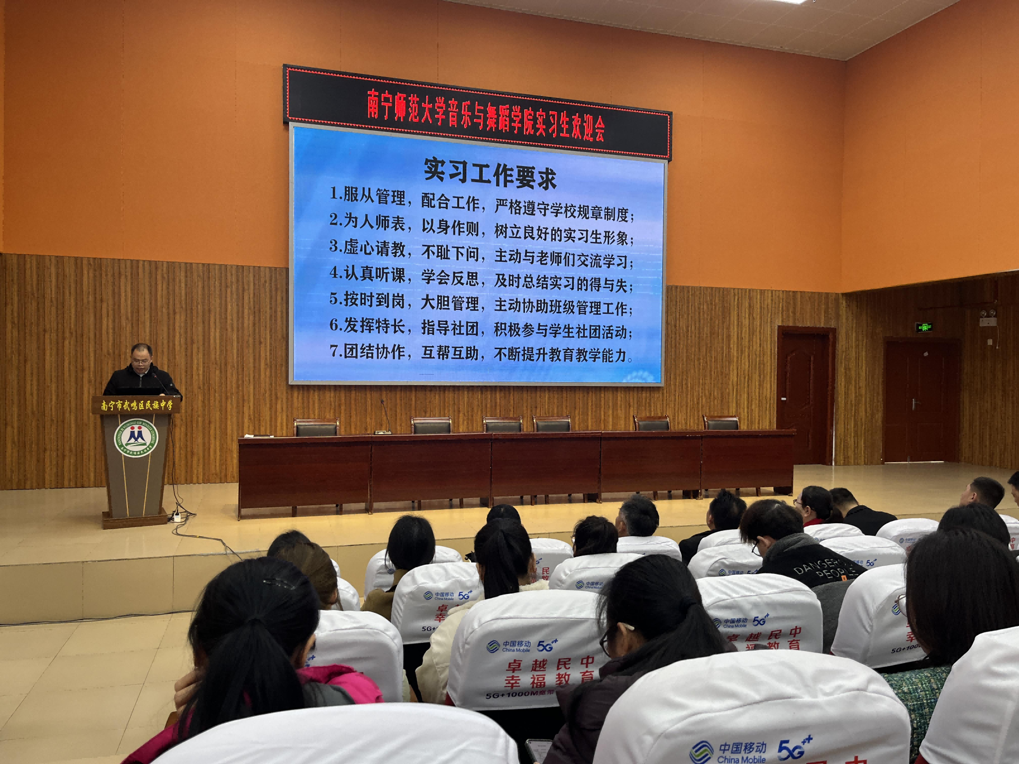 武鸣区民族中学副校长刘宇在主持会议并宣读了实习生与指导老师、班主任的结对名单,详细介绍了学校基本情况及实习工作要求,明确了指导老师与实习生的结对安排,希望实习生能做到服从管理、为人师表、虚心请教、发挥特长。