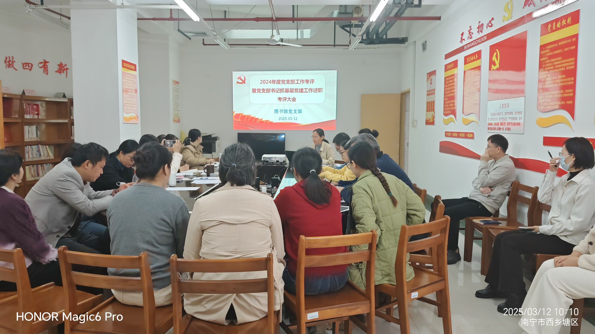 会上还开展了2024年度党支部工作考评及党支部书记抓基层党建工作述职考评,支部全体党员和5名党外群众代表参加。叶佩珍书记传达了学校和机关党委相关文件精神,随后向与会人员作了《2024年度图书馆党支部工作总结》和《2024年图书馆党支部书记抓基层党建工作述职报告》,她希望全体党员以此为契机,不断强化理论武装,提高政治站位,增强服务意识,增强担当作为,共同推动党支部工作再上新台阶,为学校高质量发展再做新贡献。