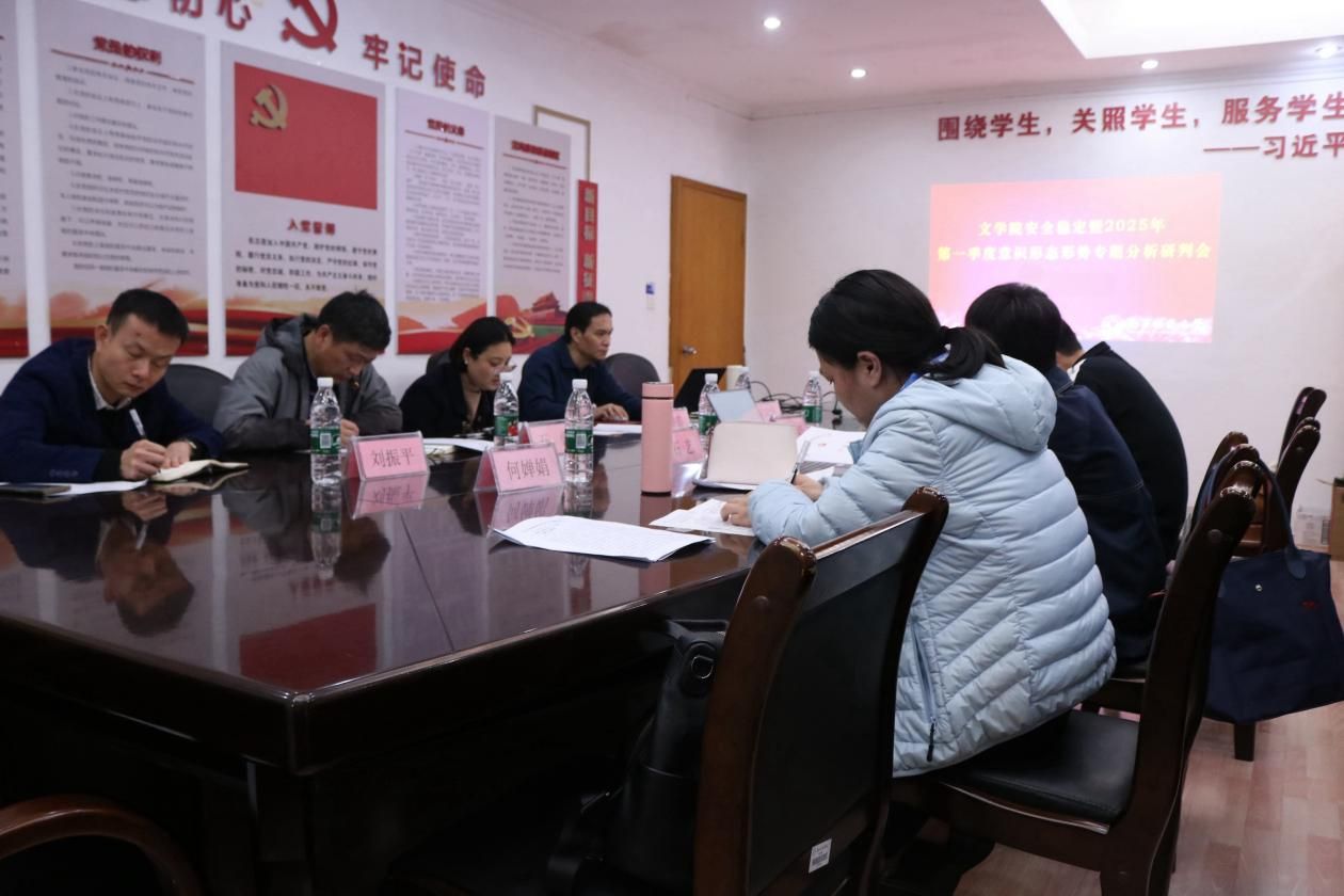 2025年3月14日,文学院召开2025年第一季度安全稳定工作暨意识形态形势分析研判会,文学院全体党委委员与部分教职工代表参加会议。