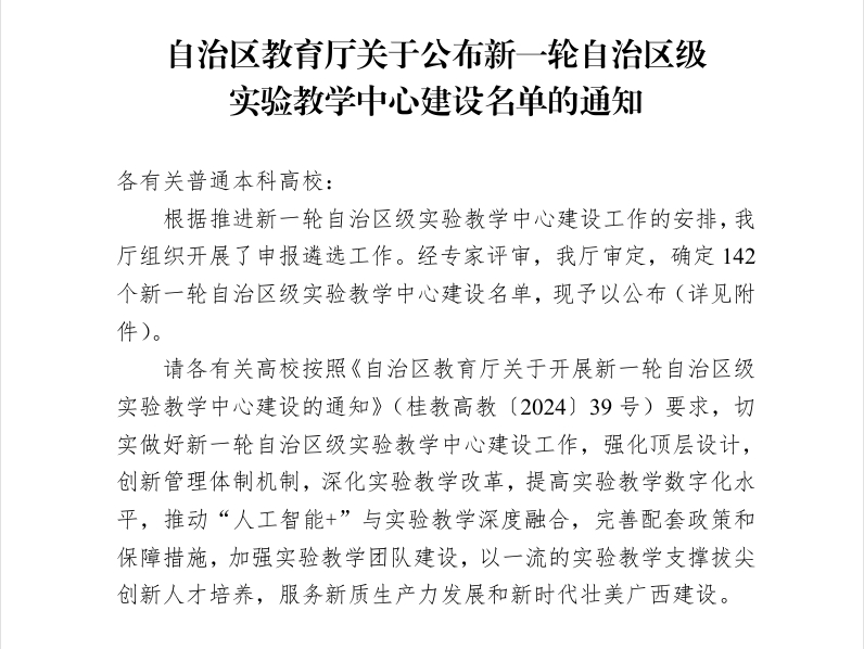 根据《自治区教育厅关于公布新一轮自治区级实验教学中心建设的通知》(桂教高教[2025]6号),经专家评审,自治区教育厅审定,我校自然资源与测绘学院段炼教授牵头申报的“自然资源智能监测与大数据分析工程实验教学中心”成功入选自治区级实验教学中心,且为本轮评选中我校唯一的A类中心。该中心既是学院实施党建引领高质量发展工程成果,也是继学院成功获批“卫星+”空间AI自然资源智能治理广西高校工程研究中心后,又一项教学科研平台的建设成果。
