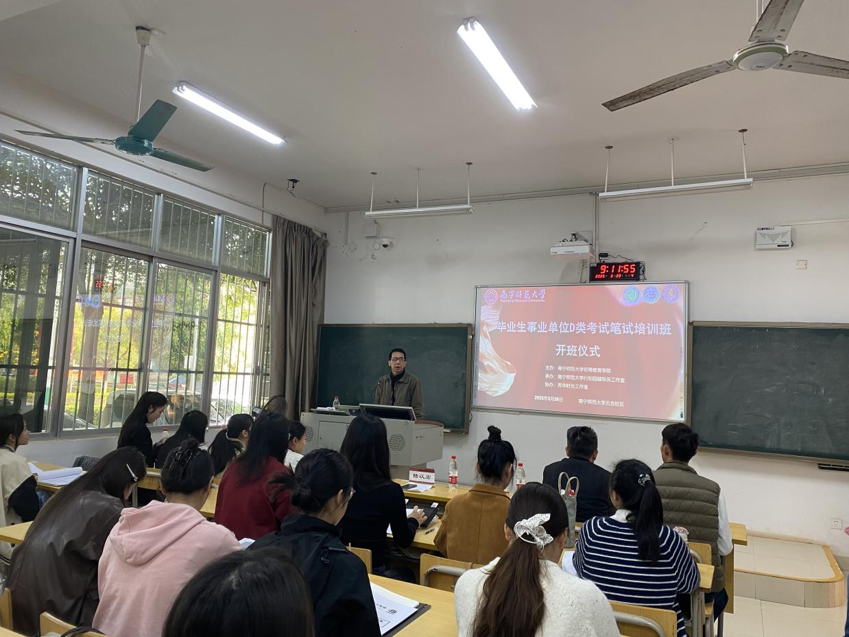 3月20日上午,毕业生事业单位D类(中小学教师类)考试笔试培训开班仪式在五合校区五综教学楼106教室举办。本次培训会由初等教育学院主办,行知园辅导员工作室承办,芳华时光工作室协办,面向全校毕业生开展线下培训。初等教育学院党委书记陆以宏、副书记苏学权、学工办辅导员等出席本次开班仪式。