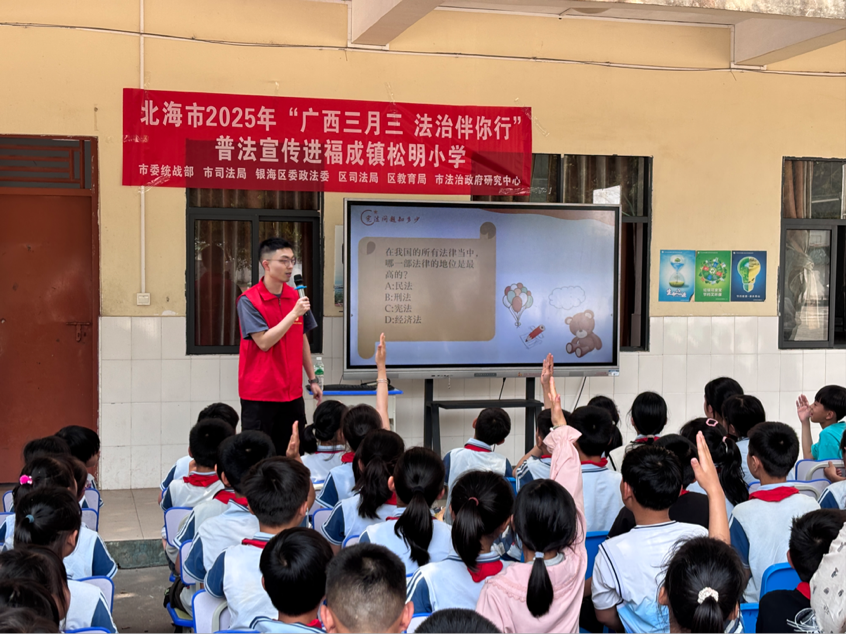 为了进一步加强青少年的法治宣传教育、提升法治素养。南宁师范大学金铜鼓普法协会成员于3月26日受邀参加由北海市委统战部、北海市司法局以及广西“小法宝”青少年普法栏目组承办的“广西三月三,法治伴你行”普法宣传进校园活动。