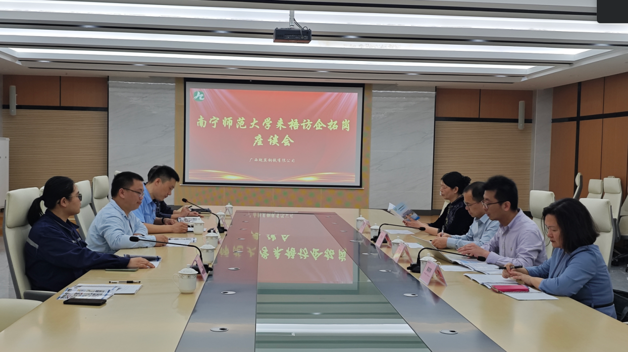 在广西翅冀钢铁有限公司,调研组跟随公司人力资源处走进了钢材生产车间、化验大楼、公司配套生活休闲娱乐设施进行参观。随后调研组与广西翅冀钢铁有限公司开展座谈会、与往届毕业生代表开展座谈,两个学院领导分别介绍了2025届毕业生信息,并邀请广西翅冀钢铁有限公司参与校园专场招聘会,双方就深化校企合作、产教融合,创新人才培养模式等方面进行了深入交流。
