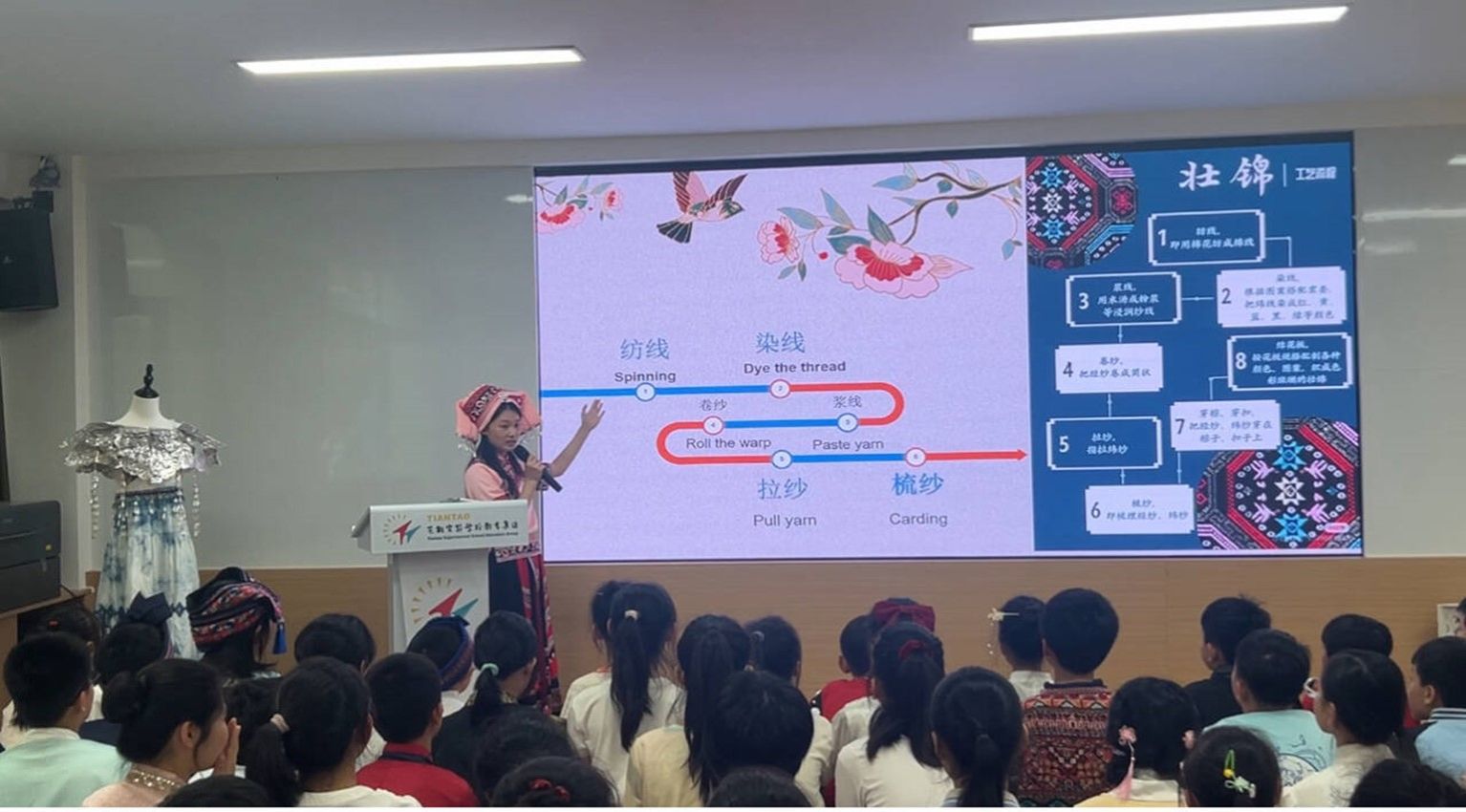 与此同时,一场关于广西壮族传统手工艺品----壮锦的介绍也在天桃实验小学的创新智慧教室展开了。2023级英语专业的冯佳怡同学身着壮族民族服饰,以“美丽壮锦:广西非物质文化遗产的瑰宝”为题,结合精心设计的图文和短视频向天桃实验学校的小朋友们展示并介绍了壮锦的美丽花色、壮锦图案中的动人传说、壮锦的制作流程以及壮锦在当代的发展与传承。在冯佳怡同学的启发和引导下,现场的小观众们当场就学会了许多跟壮锦花色、图案有关的英语表达。在有奖问答环节,小朋友们都积极踊跃参与。有的小朋友不仅记住了壮锦的制作流程还能用英语进行简单地介绍,还有的小朋友甚至能用刚学会的英语句子,展开想象,绘声绘色地讲述了壮锦图案上的凤鸟飞进教室现场的有趣情节。
