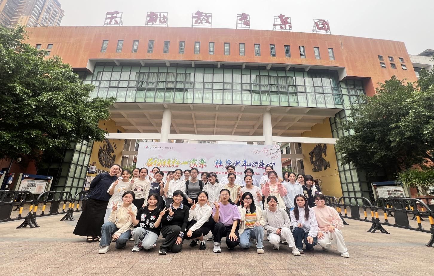 近日,南宁师范大学外国语学院英语专业2023级陶行知实验班的同学们在班主任刘婷婷老师的带领下,来到南宁市天桃实验小学银杉校区,以“传承回响,拥抱世界,用英语讲中华民族文化”为设计主题参与到了该校举办的铸牢中华民族共同体意识教育暨2025年广西“三月三”庆祝活动中。