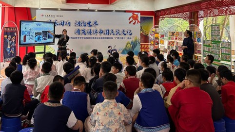 活动伊始,一场关于绣球和扎染的精彩小课堂在天桃实验小学的文化长廊拉开了此次活动的序幕。南宁师范大学外国语学院23行知班的李姿乐同学和孔春霞同学用英汉双语为南宁市天桃实验小学的同学们介绍了彰显广西壮乡民族特色的绣球,以及作为广西非遗传承——扎染的独特技艺。在讲解中,同学们用英语介绍壮乡民族民俗文化,配以趣味互动游戏和视频观赏,在场的小观众们兴趣十足,听得津津有味。