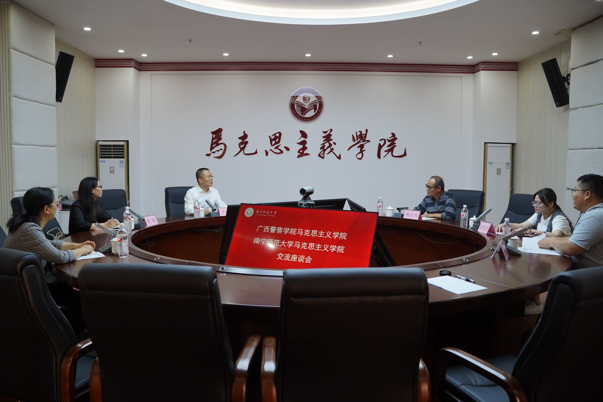 参观结束后,双方围绕“形势与政策”课程建设进行了深入交流。杨宗兴系统介绍了马克思主义学院“形势与政策”课程在课程体系构建、师资队伍建设、集体备课模式及教学安排等方面的创新举措与实践经验。刘艳闽重点展示了马克思主义学院实践教学特色,通过“三三制”微教学平台生动呈现了实践课程的育人模式与教学成果。常叔杰介绍了广西警察学院马克思主义学院“形势与政策”课程的建设情况,表示我校马克思主义学院的先进经验为广西警察学院的“形势与政策”课程建设提供了宝贵参考,希望未来能进一步加强交流合作。期间,双方就课程建设中的重点难点问题进行了深入探讨。