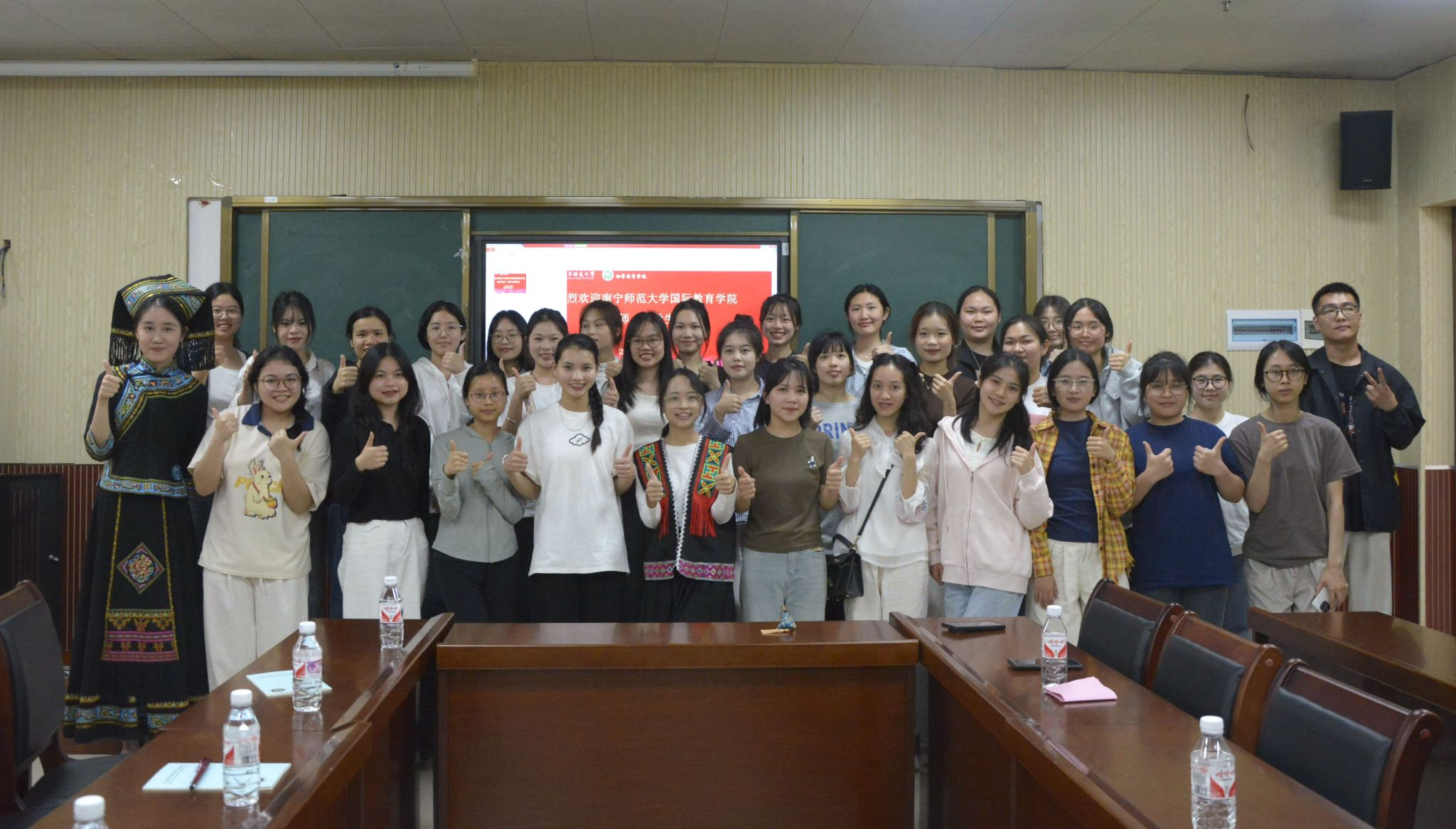在座谈交流环节,陈传忠在发言中对初等教育学院的精心安排表示衷心感谢,表示在“请进来”和“走出去”的过程中,同学们要不断提升跨文化交流能力,希望中外学生都能成为中外文化交流的桥梁和使者,让多元文化在南宁师范大学的校园中绚丽绽放。李欣对国际教育学院的师生表示热烈的欢迎,希望此次交流能增进彼此的了解和友谊。初等教育学院的学生干部详细介绍了学院的特色学生活动,如师范生教学技能竞赛、壮语文教学技能大赛、课本剧大赛、劳动教育素质拓展活动等,引起了留学生们浓厚的兴趣。在自由交流环节,中外学生积极互动,分享各自的学习生活体验,现场气氛热烈而友好。