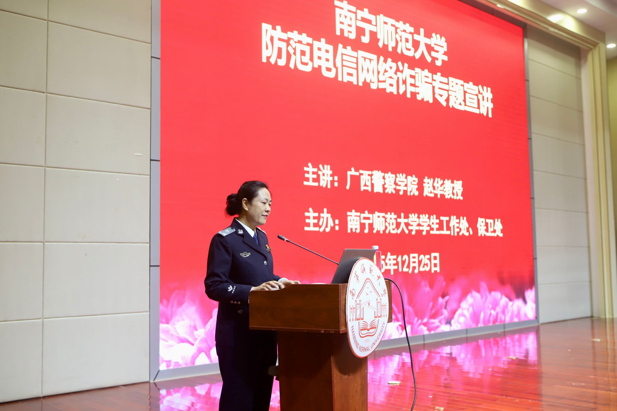 12月25日,自治区教育厅反诈专家宣讲团赵华教授到我校五合校区文理综合楼114报告厅顺利开展了反诈防骗主题宣讲活动。我校党委学生工作部副部长邓运明、有关学院辅导员与保卫处负责同志全程参与,现场共有约300名学生参加。